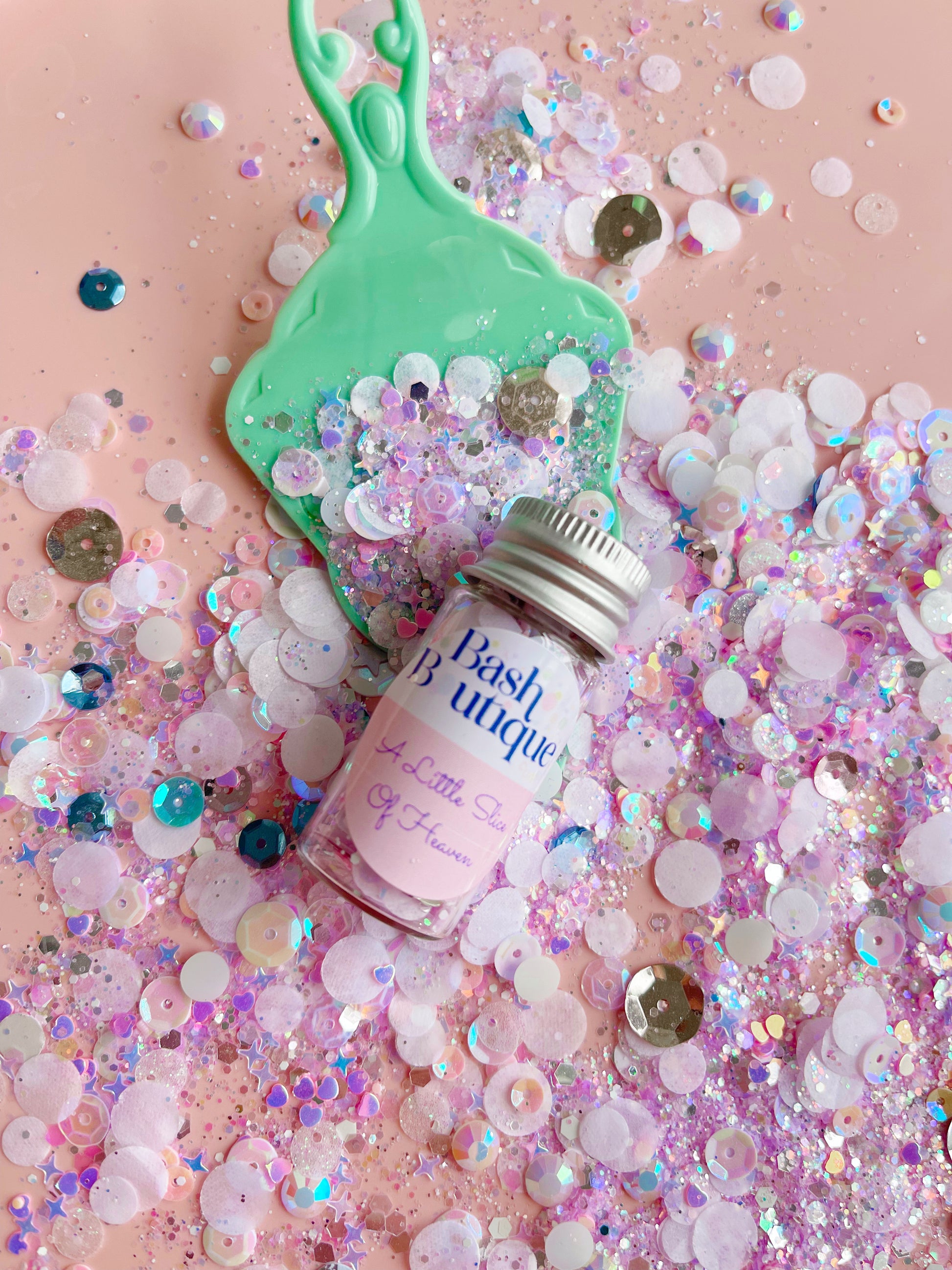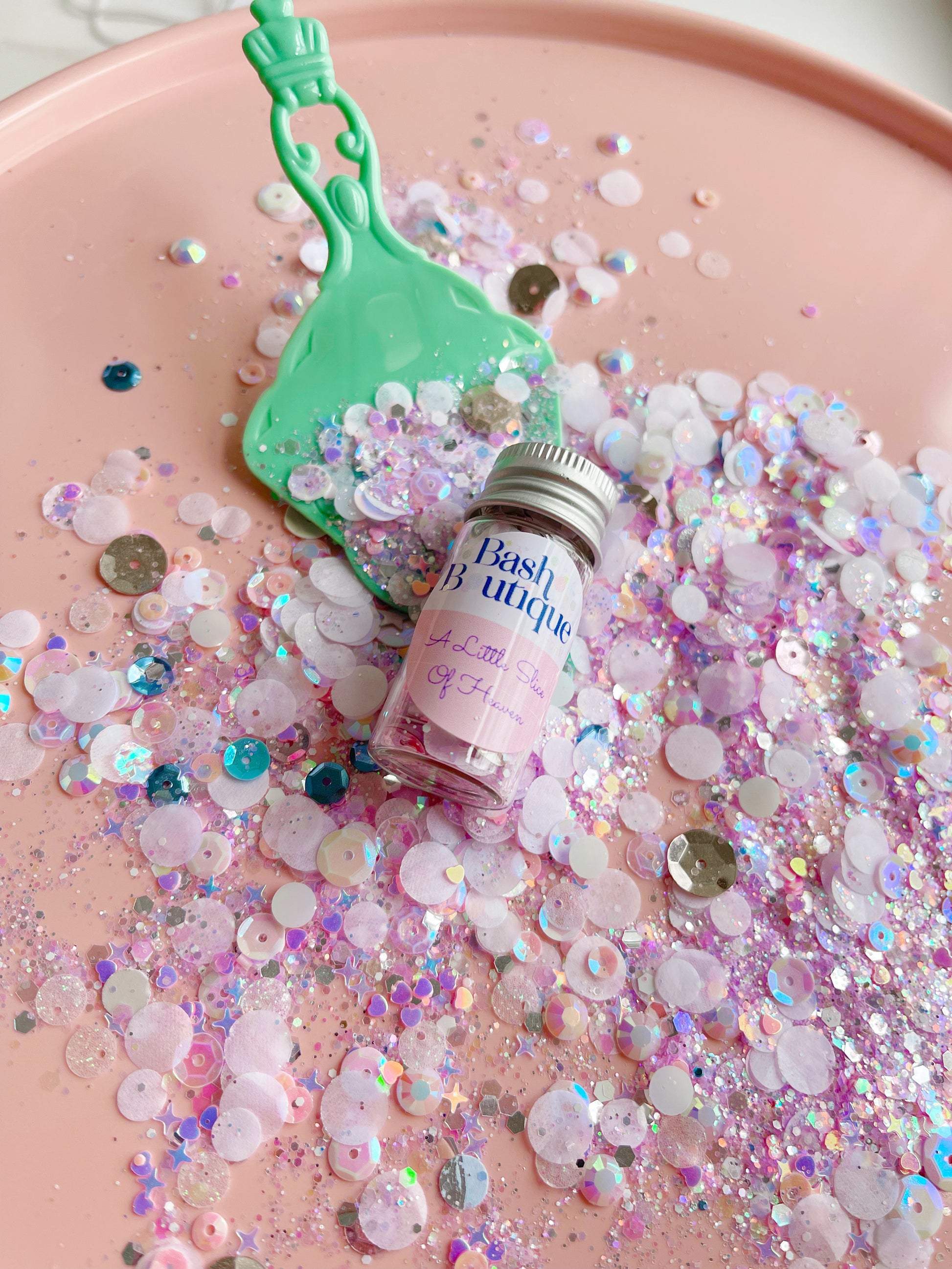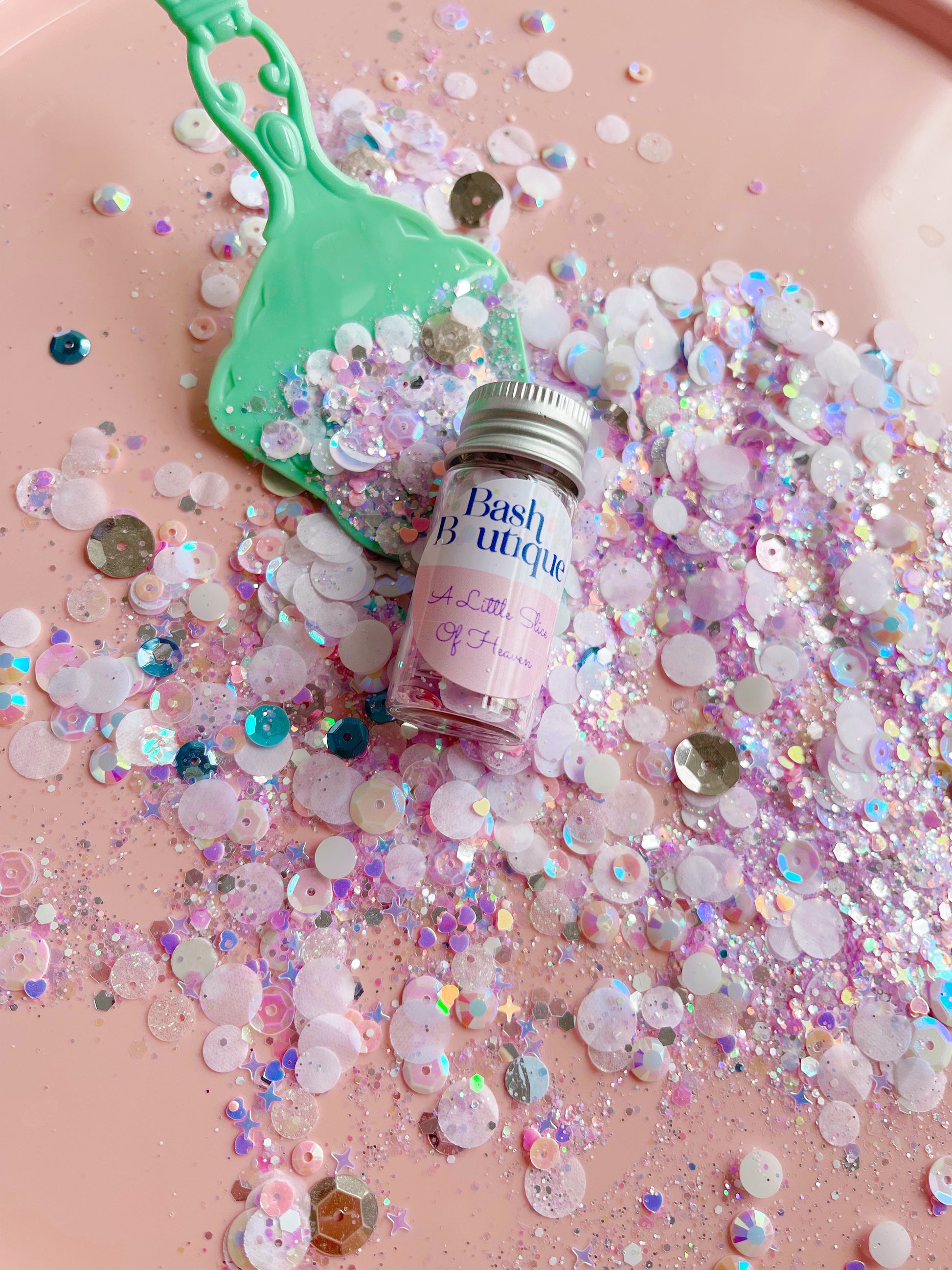 Contained in a glass vial, this is the perfect amount of sparkle to add a little slice of heaven to any day. Mostly iridescent with touches of muted golds, blue hues and the lightest of pinks.