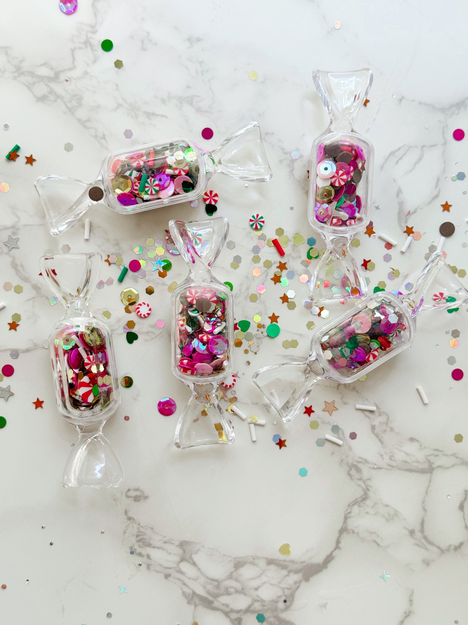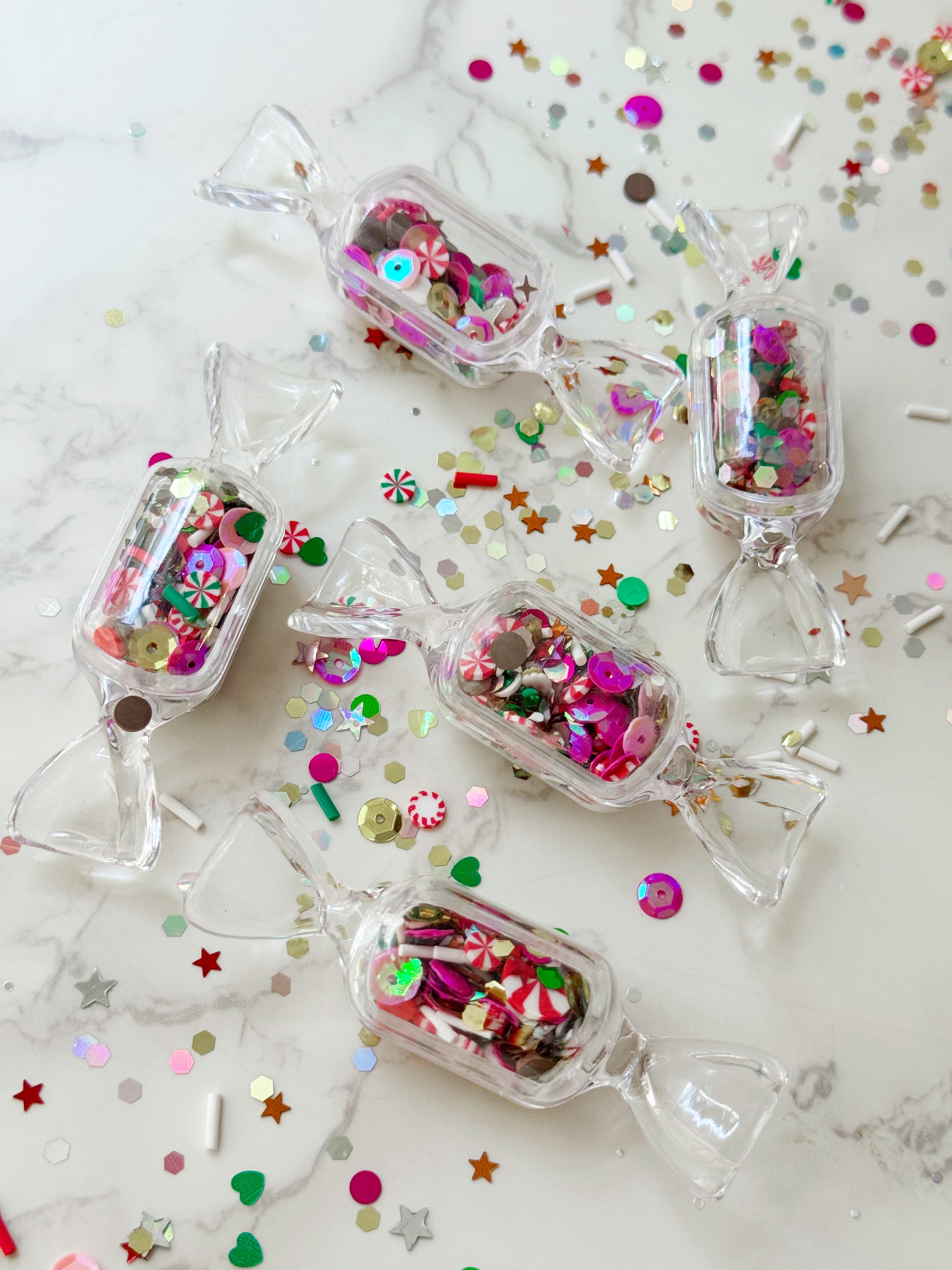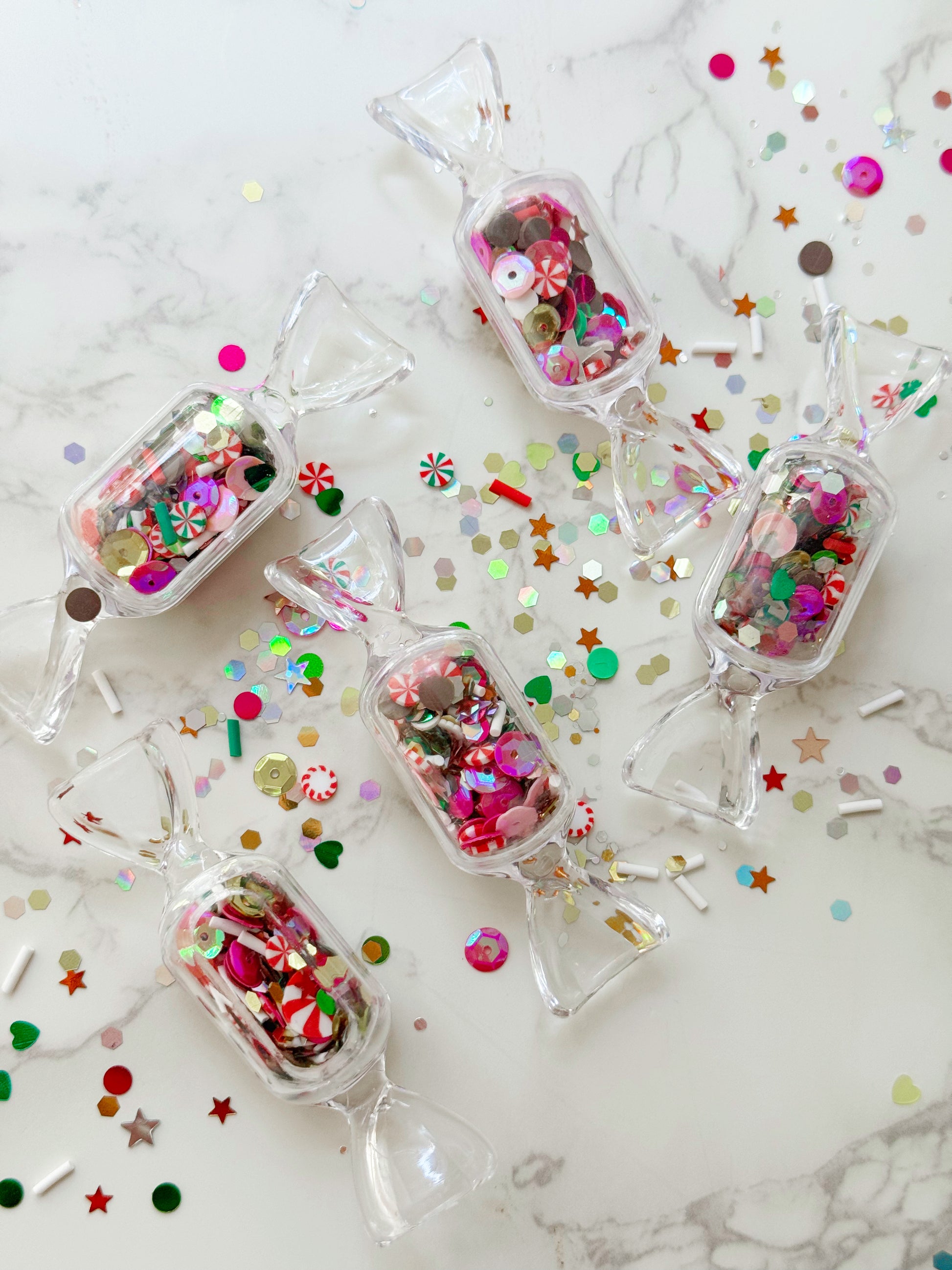 Confetti candies filled with Peppermint Kisses. These candies would make the cutest stocking stuffers, table scatter, gift topper, or sparkly play! SO many fun ways to play with these darling confetti candies.