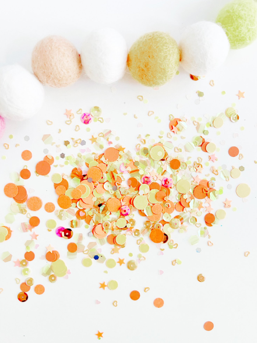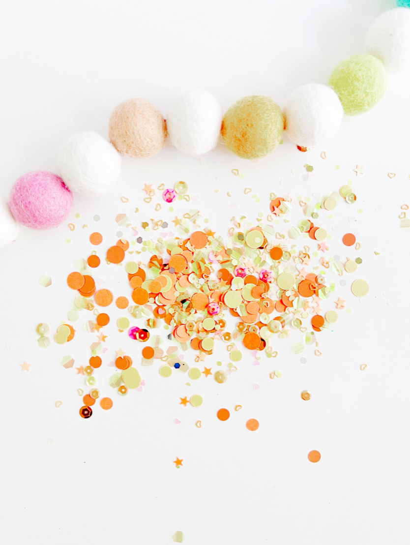 Various orange and tangerine colored confetti mixed with lots of orange sequins and sparkle! What will you do with this confetti mix? I see orange cocktails, mimosas and all things citrus in your future! This monochromatic confetti mix is perfect for: