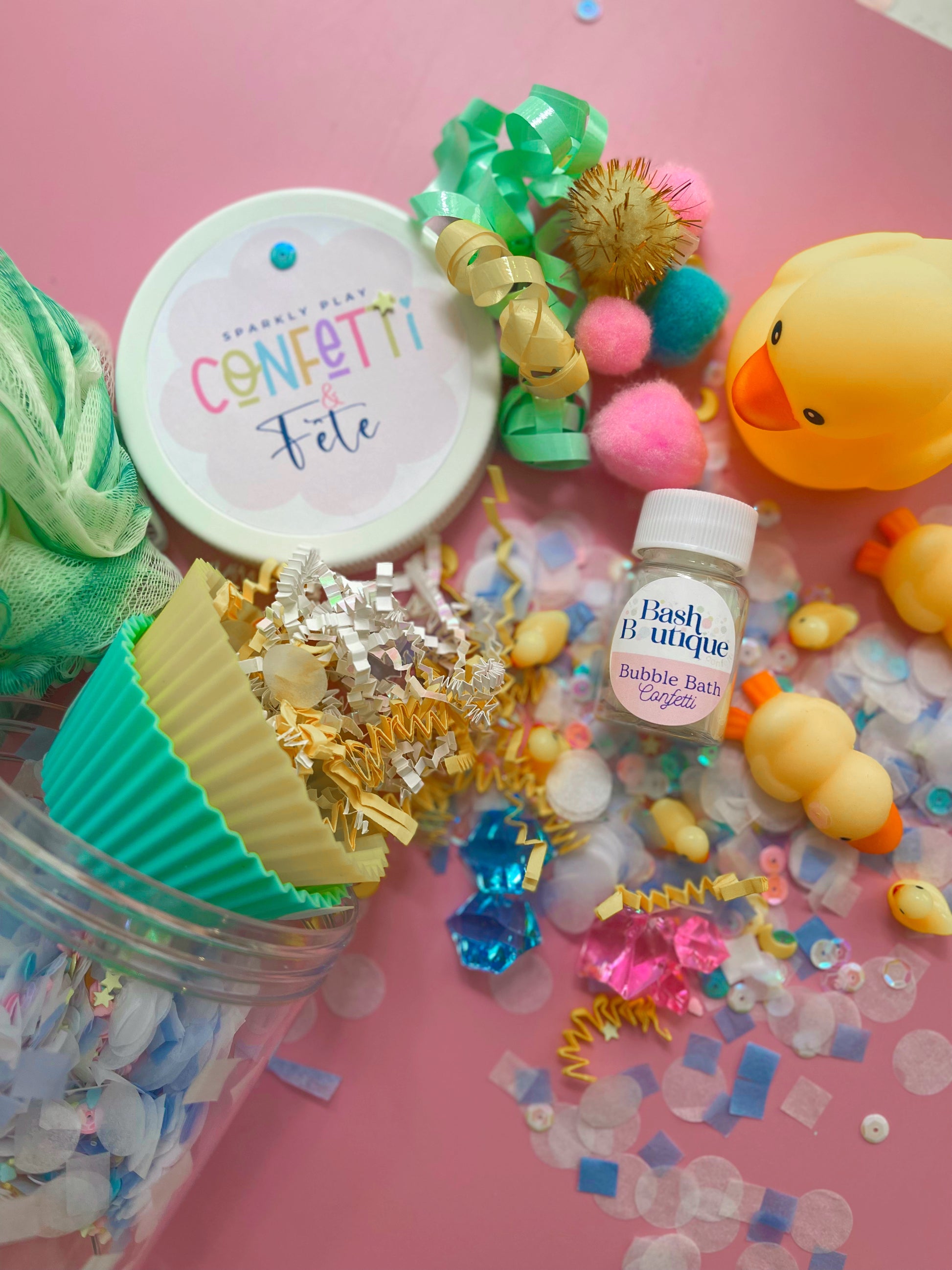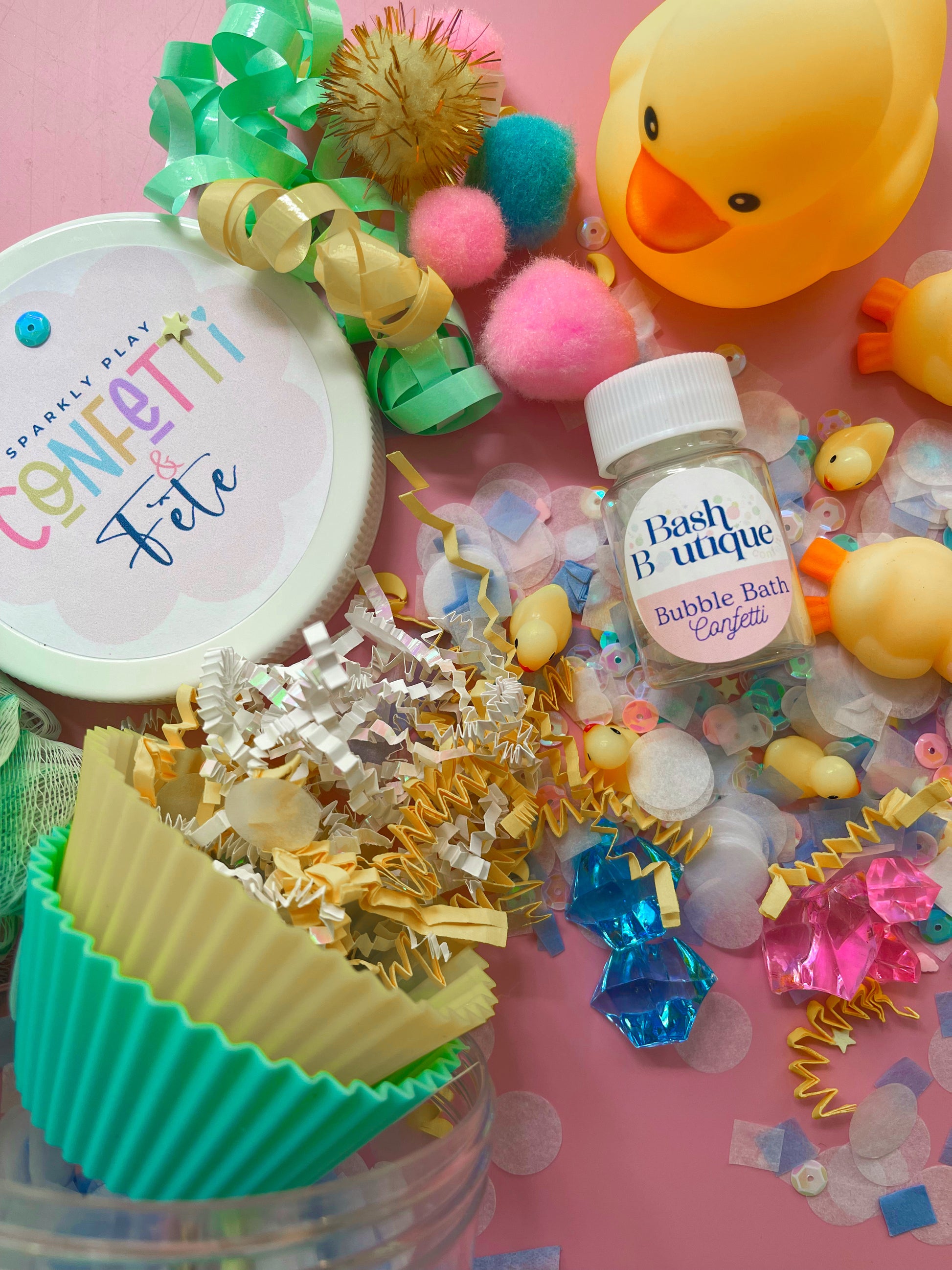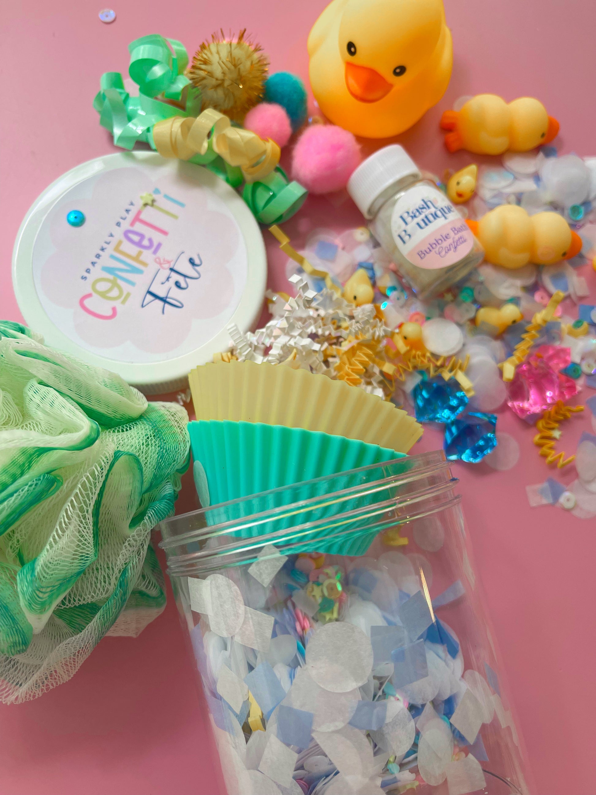 One 10 oz jar filled with colorful confetti and other sensory play toys. Confetti & Fete jars are the perfect screen free distraction and make great gifts and party favors as well! This jar is extra interactive as it comes with a miniature loofa for the little ones to "bathe" their rubber ducky with!