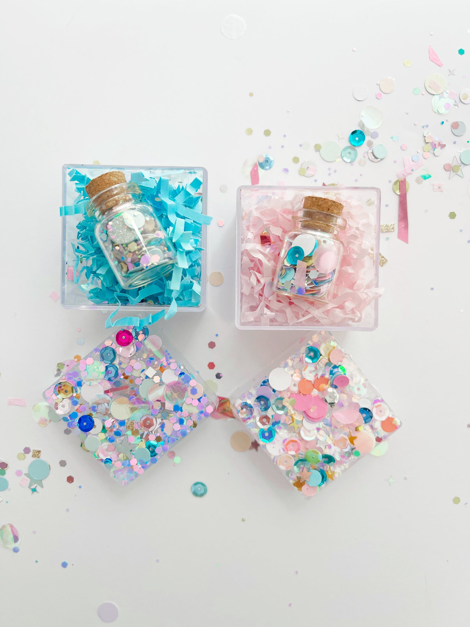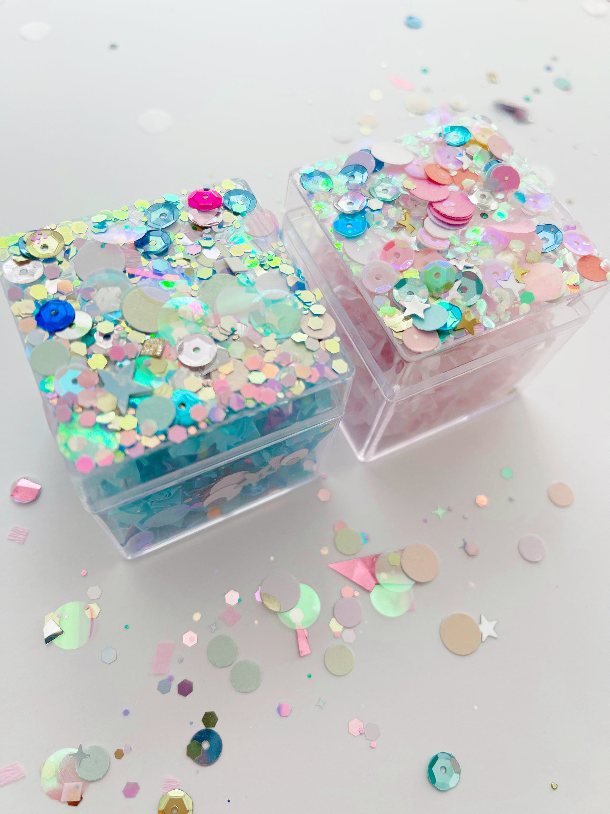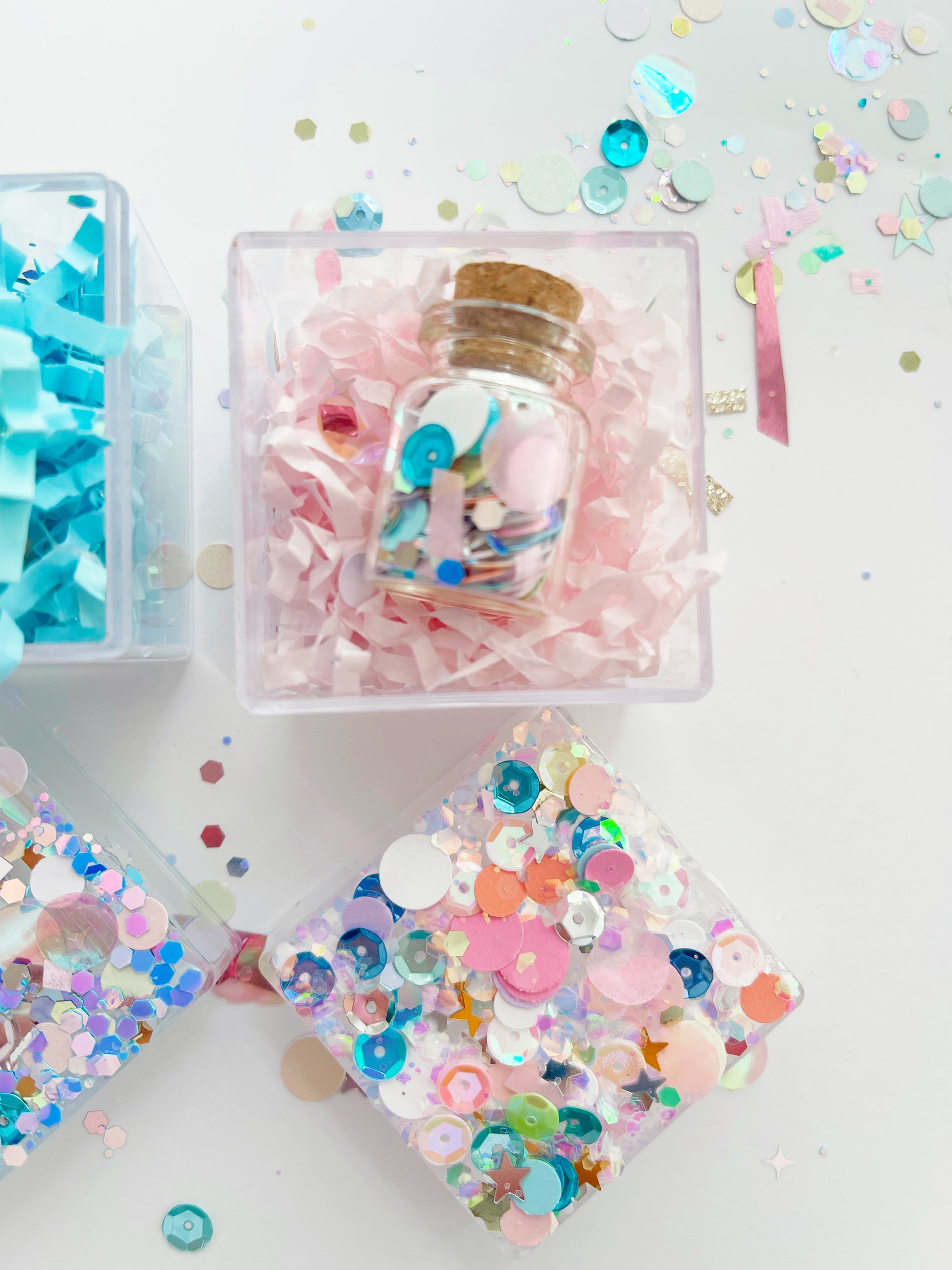 The sparkliest 2 x 2 x 2 box which includes a miniature vial of matching confetti. Sprinkle the confetti in the box or include inside the card you plan to use! Perfect for gifting small items or storing keepsakes.