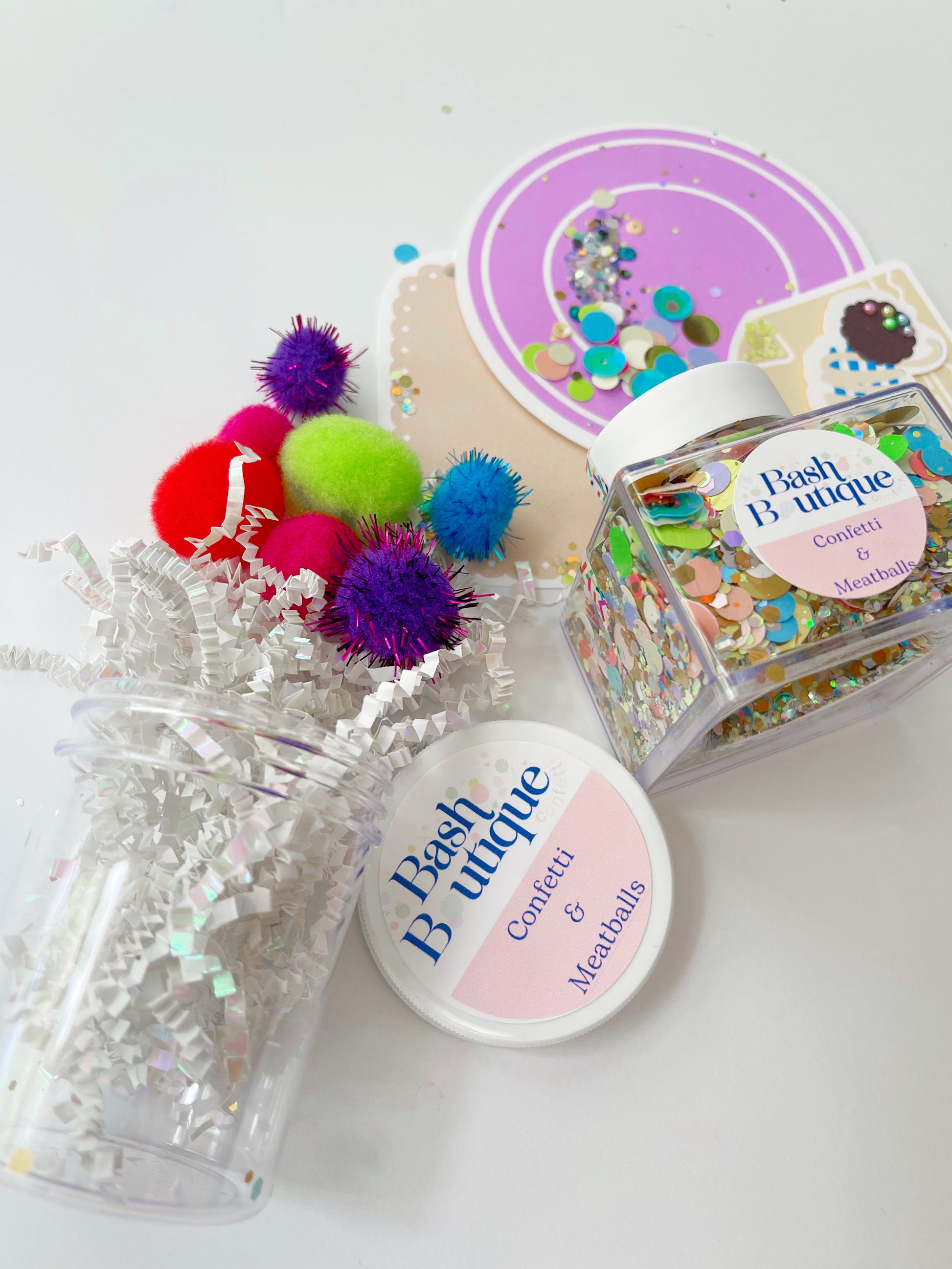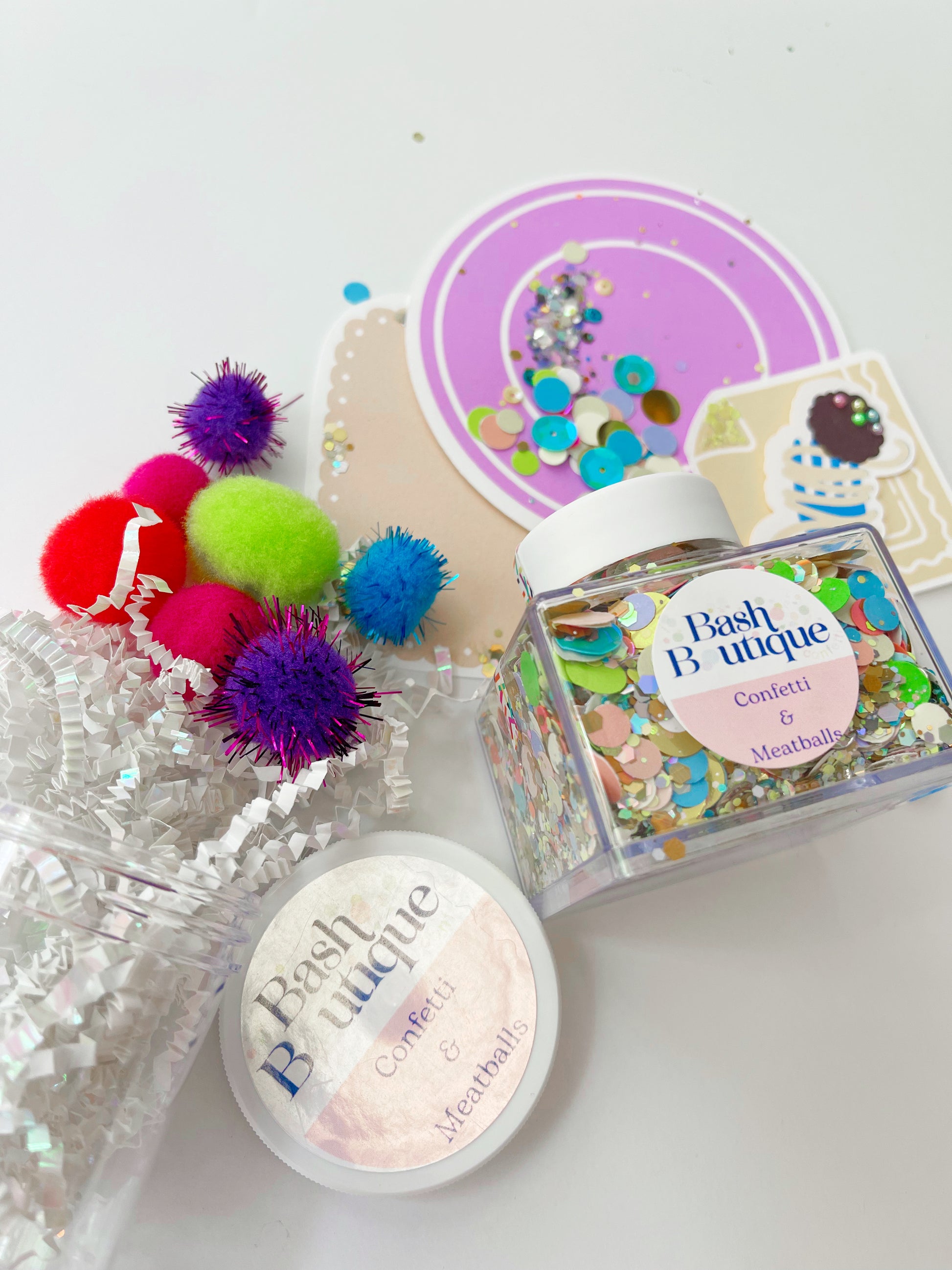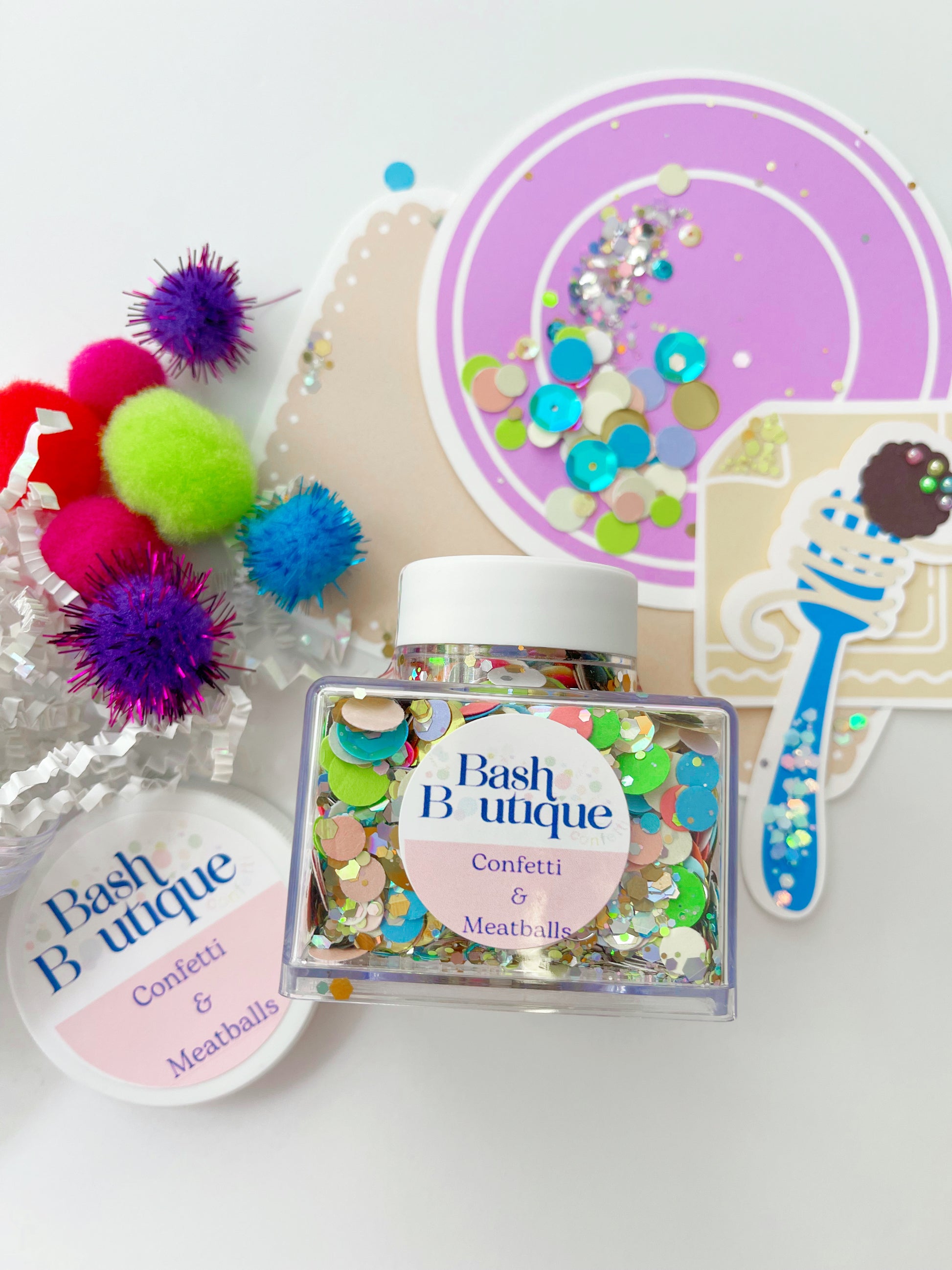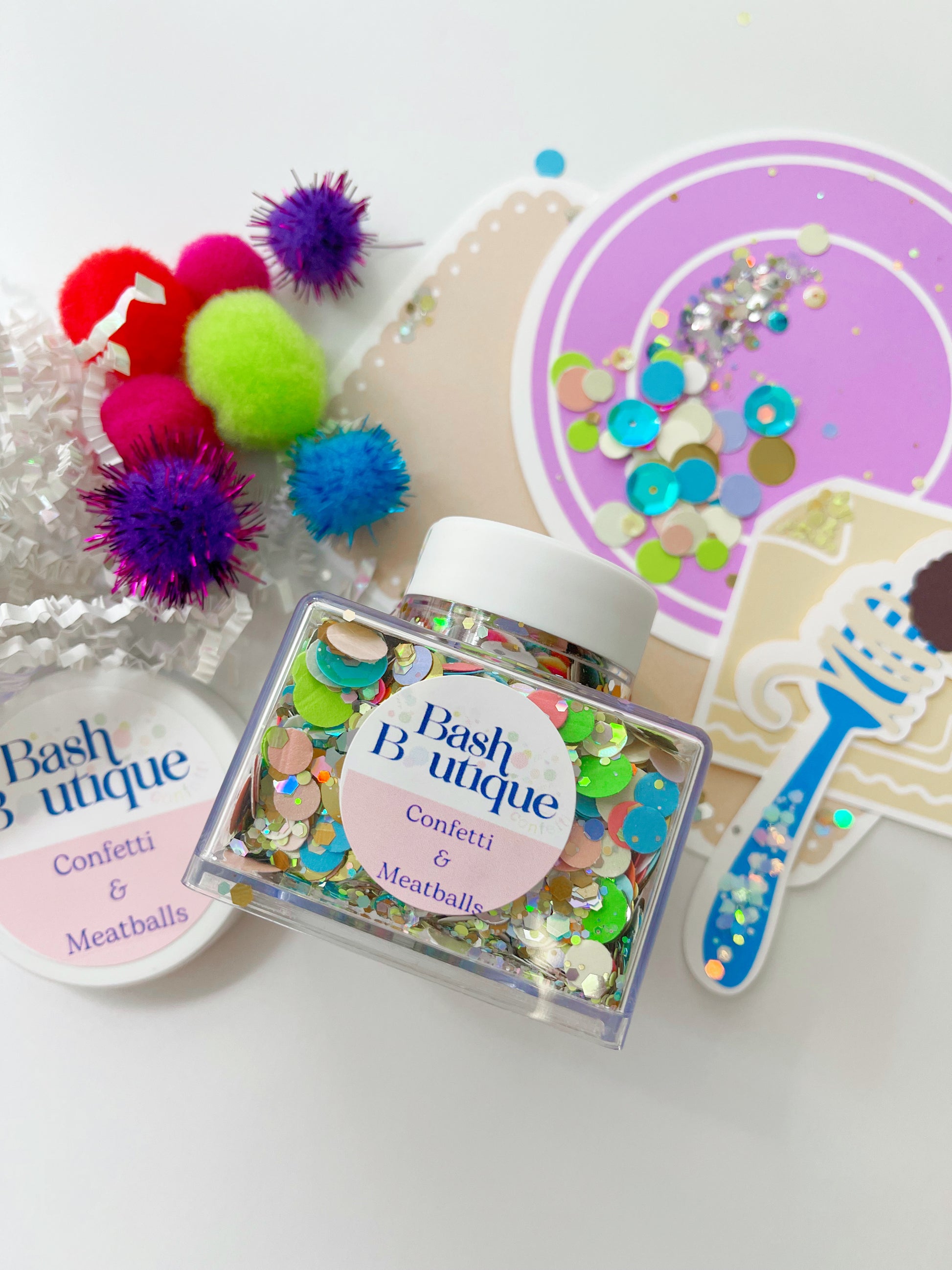 A fun, interactive confetti mix with "Spaghetti and meatballs" (crinkle paper and poms) in a 4 ox jar, a placemat, plate, fork and napkin confetti accent. Then parmesan cheese (confetti) in a confetti shaker. So much fun to make believe or decorate with!