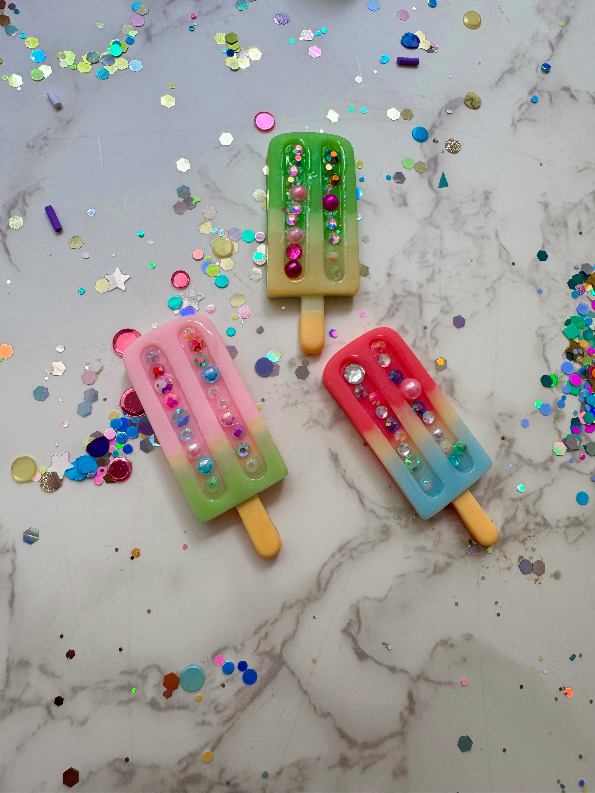 Colorful resin popsicles embellished with sparkle! Fun for flatlays, table scatter or sparkly imaginary play!