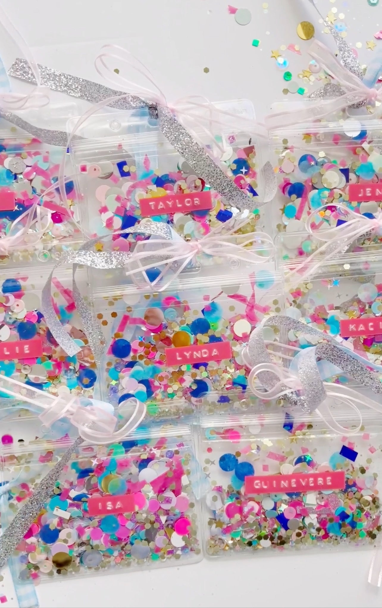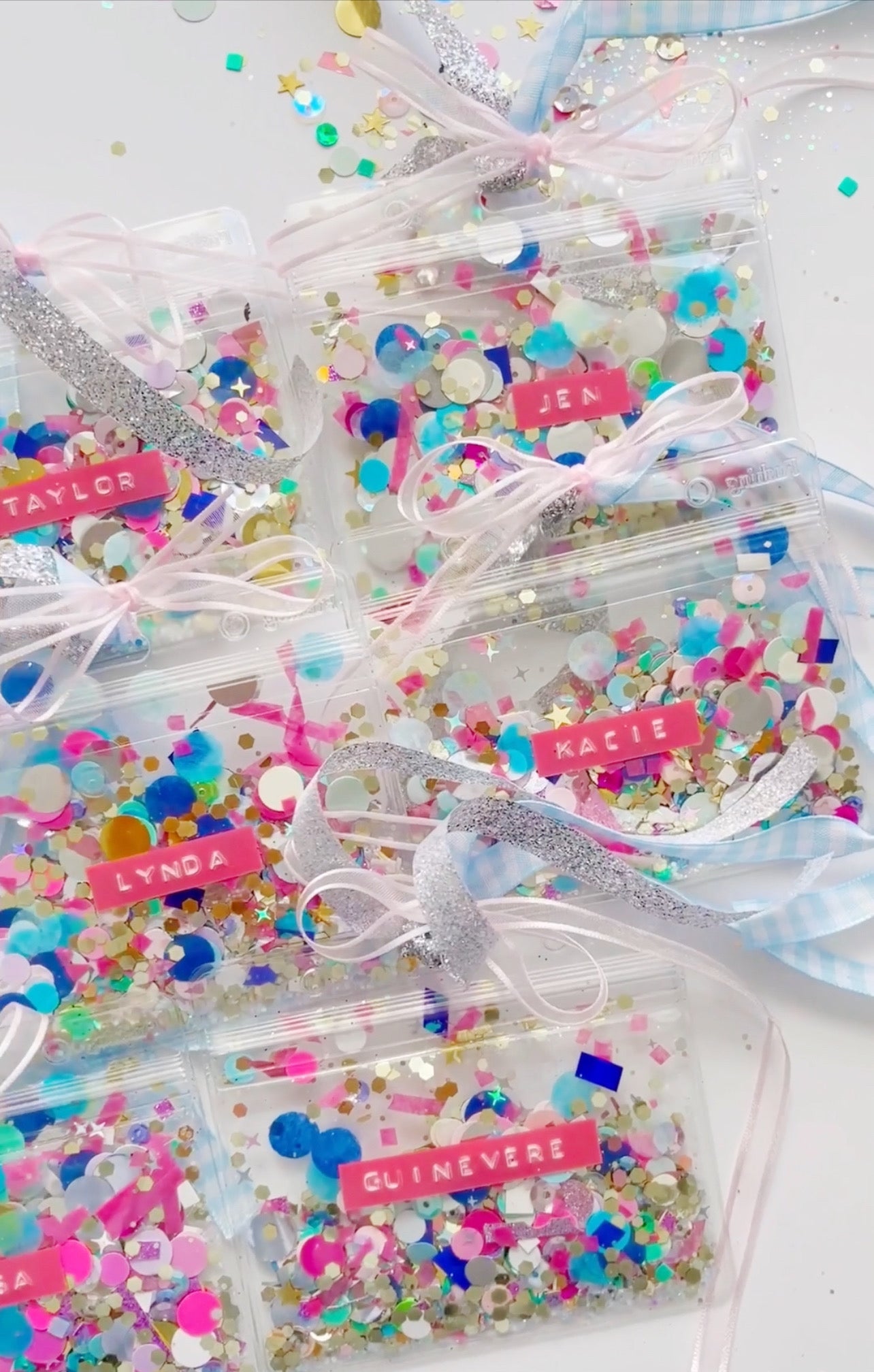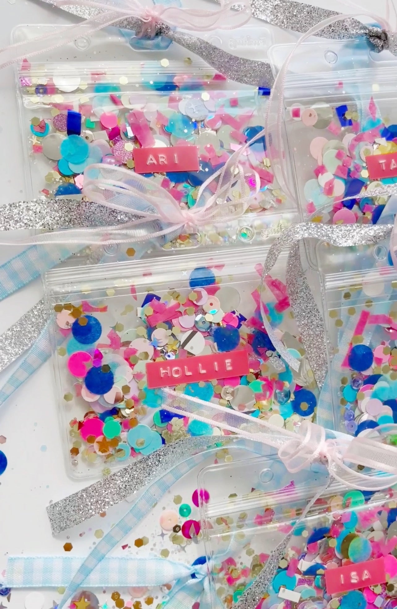 Confetti name tags are great for backpacks, suitcases, beach bags or simply used as decor! Please choose 5 confetti colors (or a confetti mix that you love from my shop) and specify the persons name or saying you would like written on your tag and voila! The sparkliest and most festive tag there is!