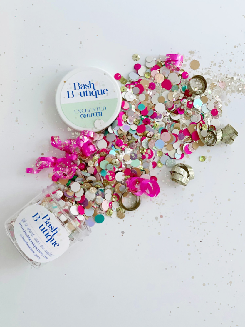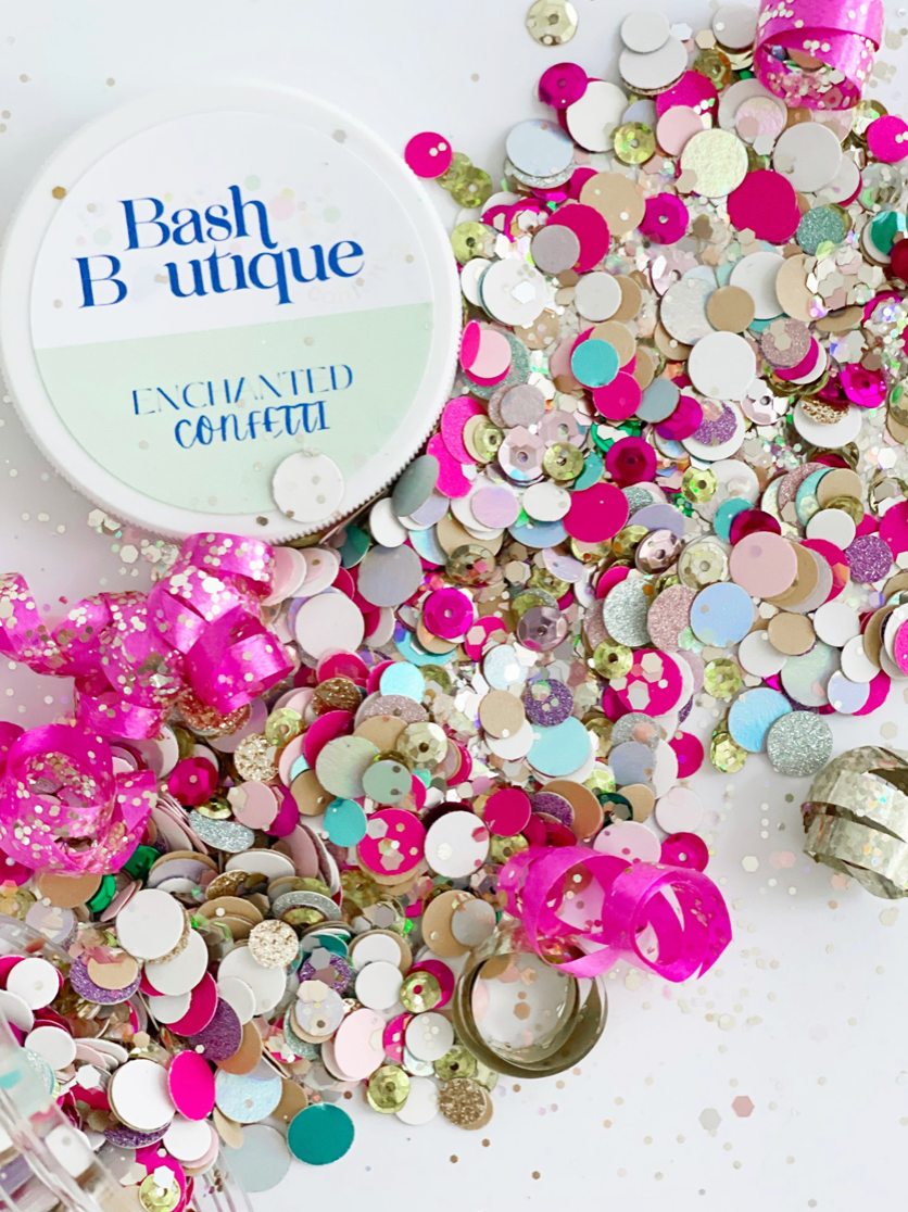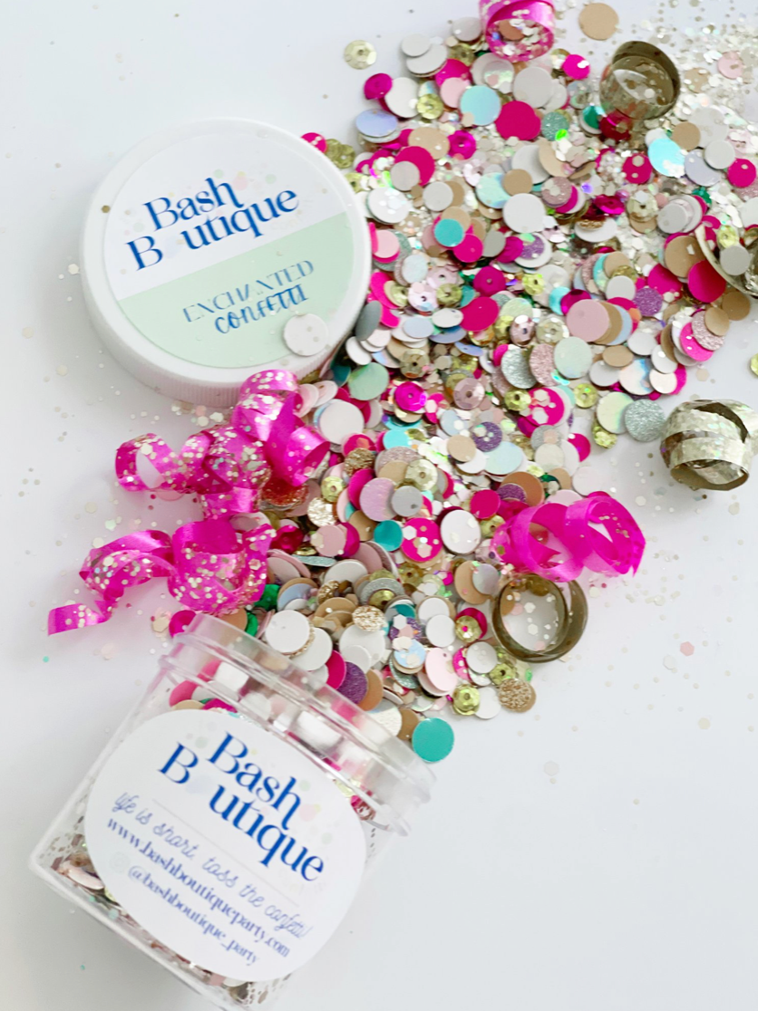 The most vibrant yet neutral confetti. This confetti is an enchanted dream! Magenta, soft metallics, creme, white and a touch of vibrant forest green.