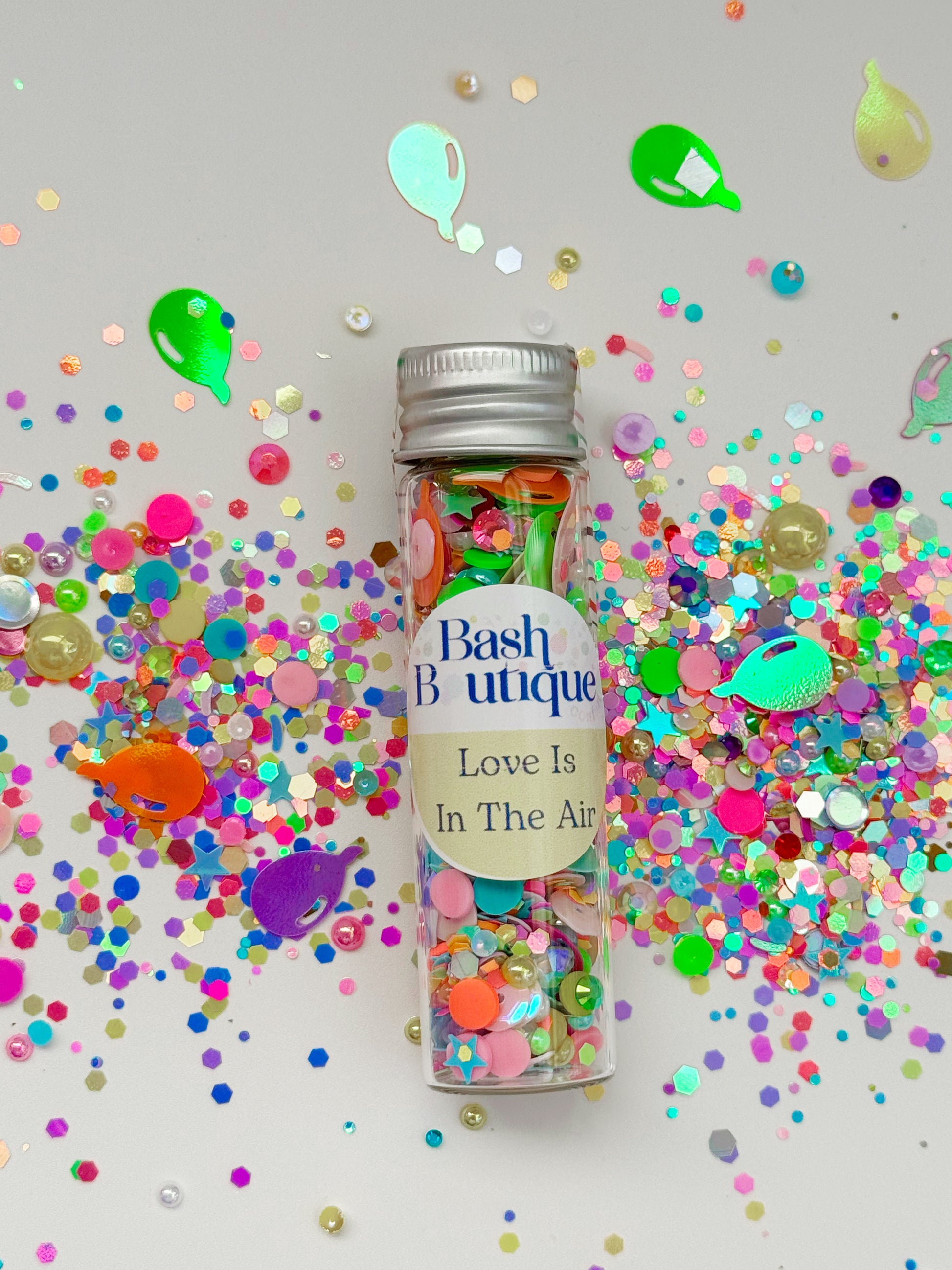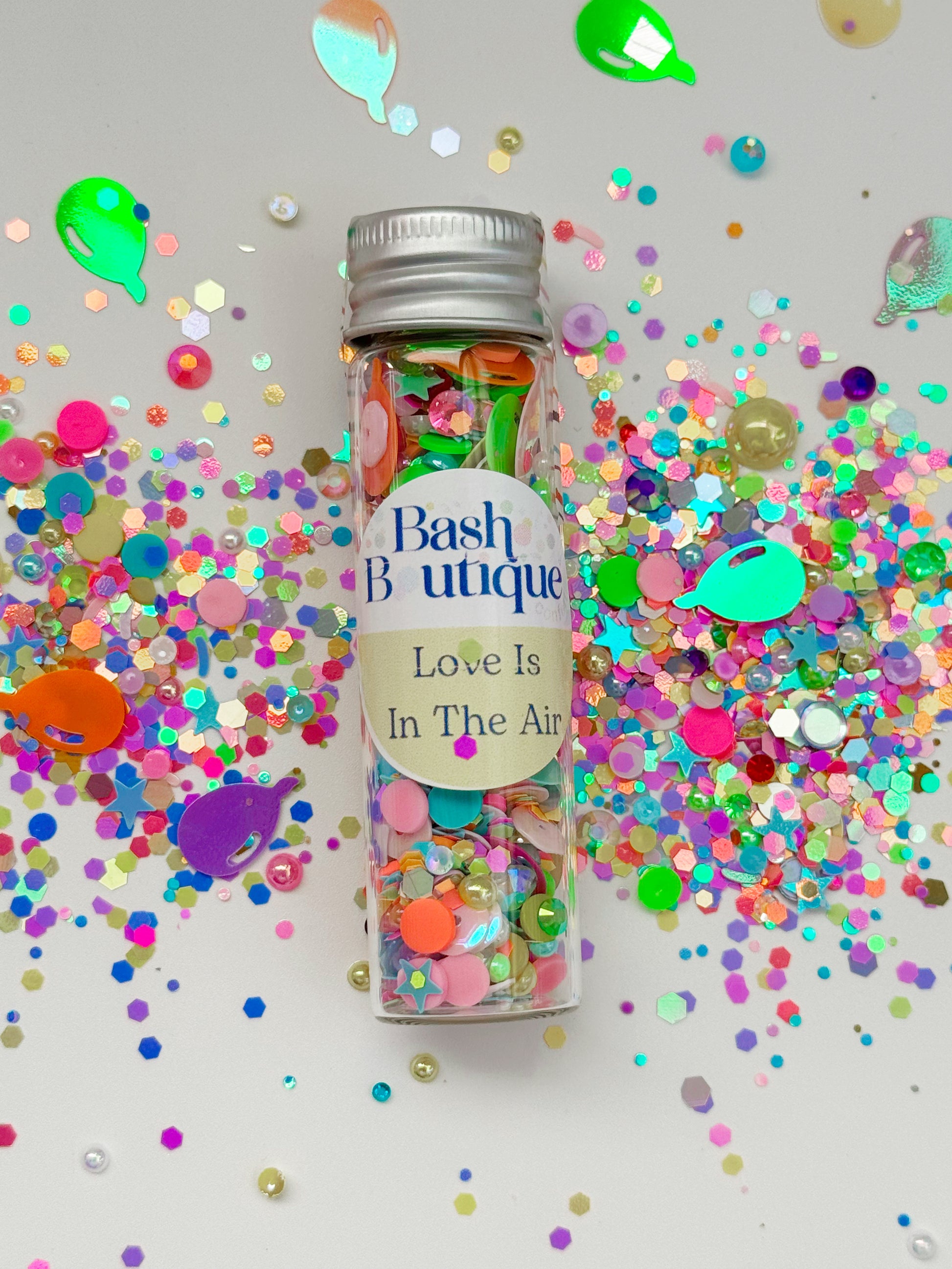 Listing is for 1 large glass vial of confetti consisting of sequins, gems, metallic ballon confetti and glitter.