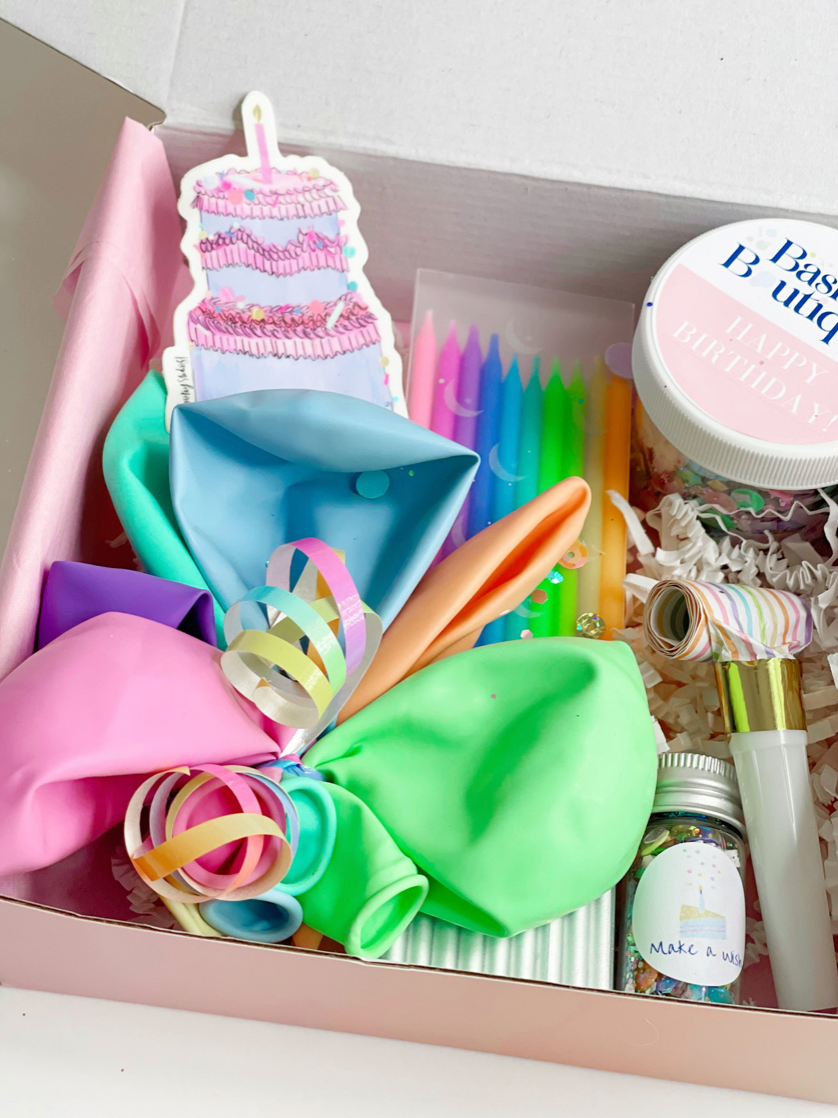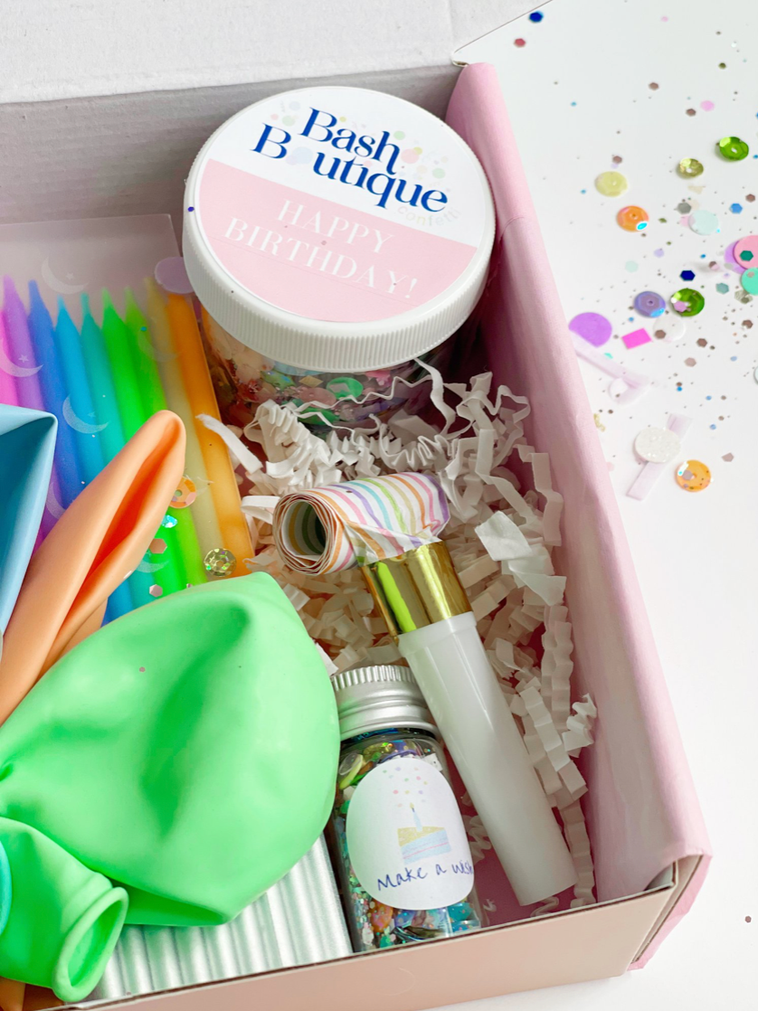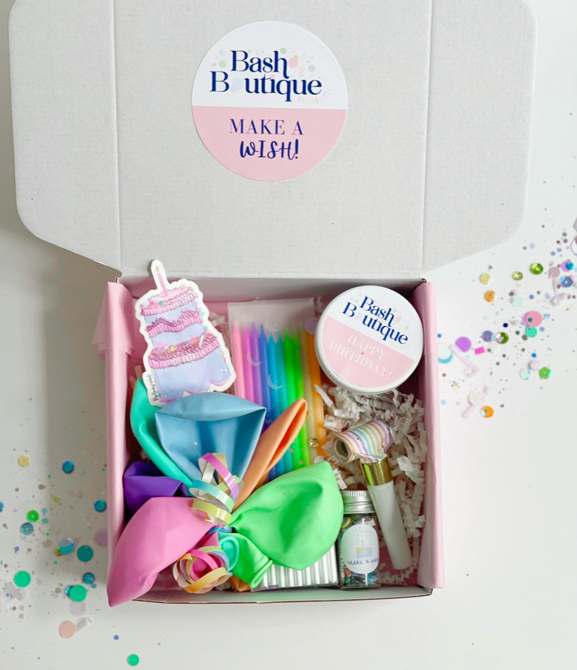 The Make A Wish box defines happy birthday! This little box of happy is the go to for anyone celebrating their next trip around the Sun. Purchase this and send to someone for their birthday or simply have this on hand for the next birthday you have on the calendar! The Make A Wish box is contained in a beautiful rainbow ombre shipping box and includes:
