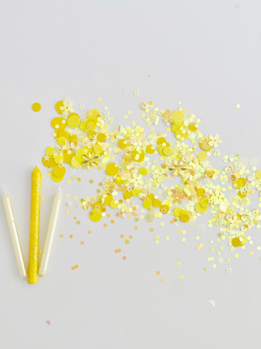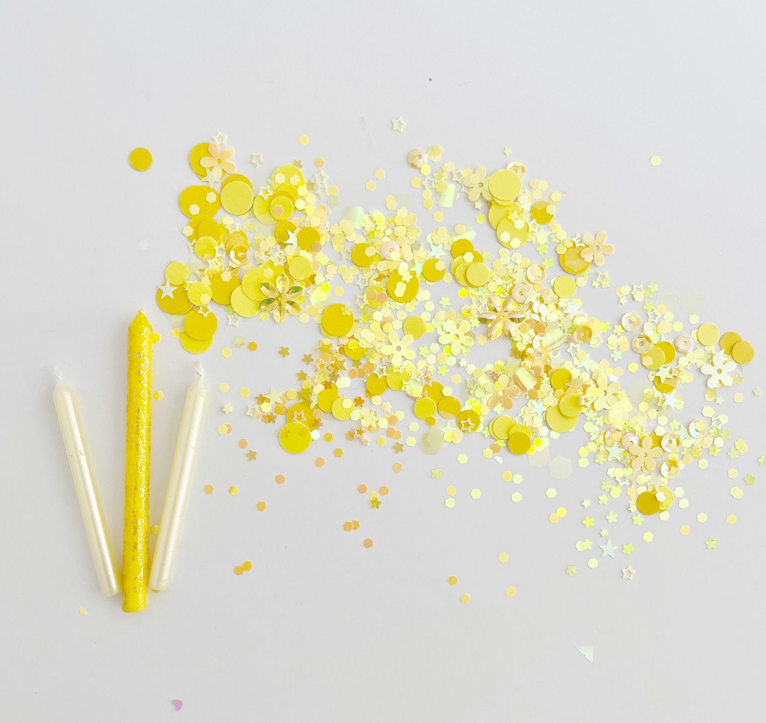 Yellow IS happy. Our Mellow Yellow Confetti mix is everything happy and more. Various yellow colored confetti, lots of yellow sequins and sparkle! Purchase this confetti mix and you’ll never be able to get Mellow Yellow out of your head. Guaranteed! This monochromatic confetti mix is perfect for: