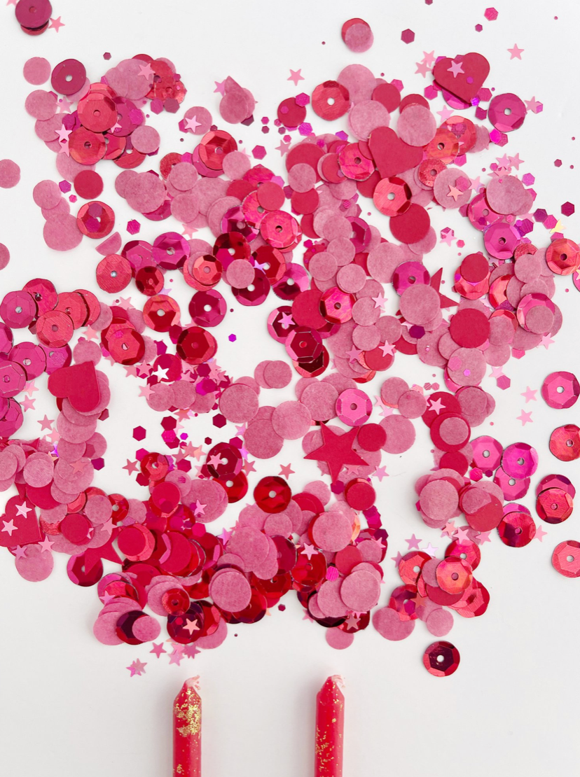 Are you seeing red? Are you reminded to the kisses, cherries and anything strawberry? Red confetti mixed with lots of red sequins and sparkle! What will you do with this confetti mix? This monochromatic confetti mix is perfect for: