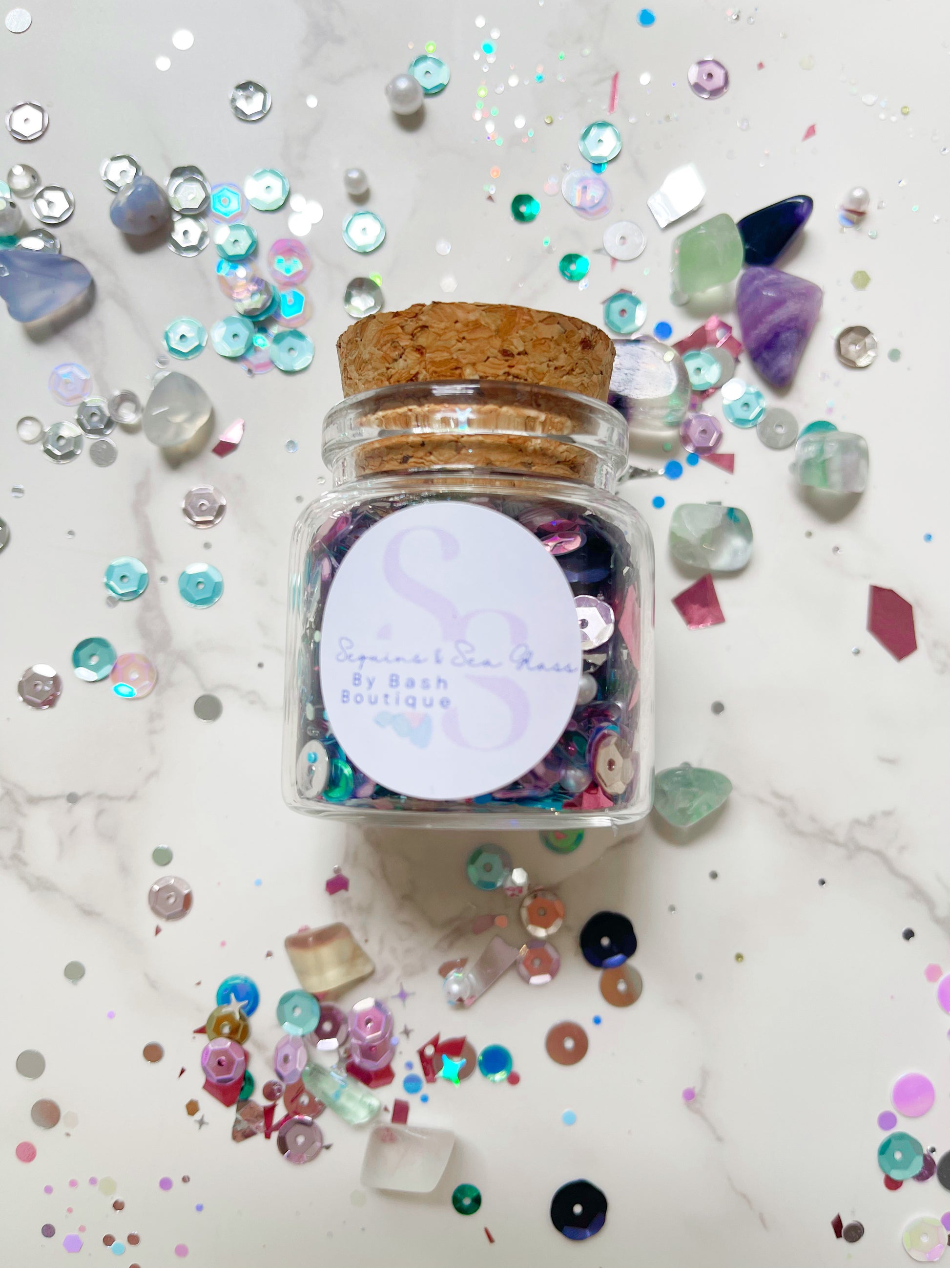 Taking confetti to another level by adding small pieces of the most beautiful Sea Glass. Mixed with pearls, sequins and the sparkliest glitter! This mix is a blend of the oceans most gorgeous colors. Each mix is lightly spritzed with my favorite coastal perfume - Beach by Bobbi Brown.
