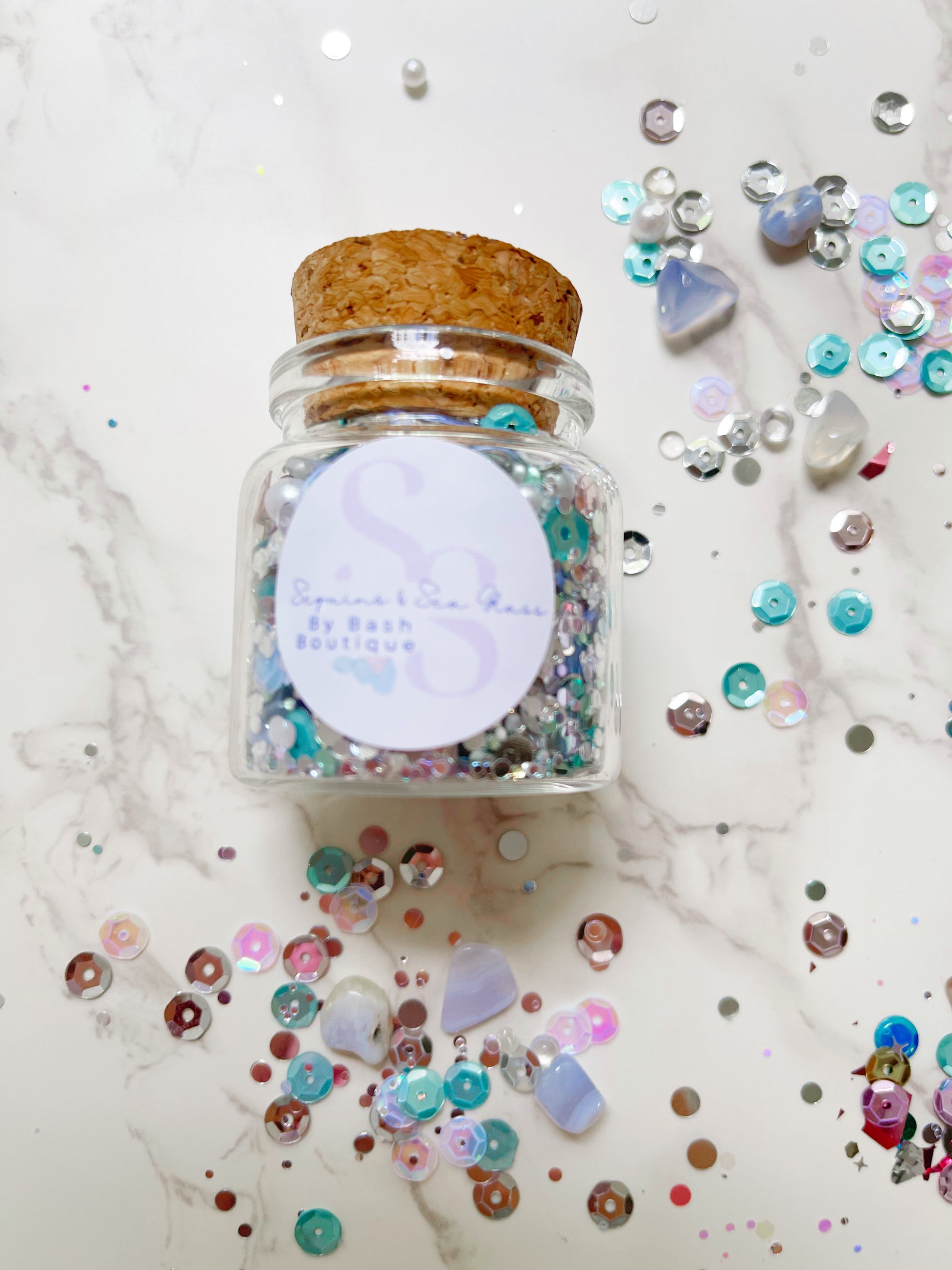 Taking confetti to another level by adding small pieces of the most beautiful Sea Glass. Mixed with pearls, sequins and the sparkliest glitter! This mix is the softest blue touched with a pop of silver.Each mix is lightly spritzed with my favorite coastal perfume - Beach by Bobbi Brown.
