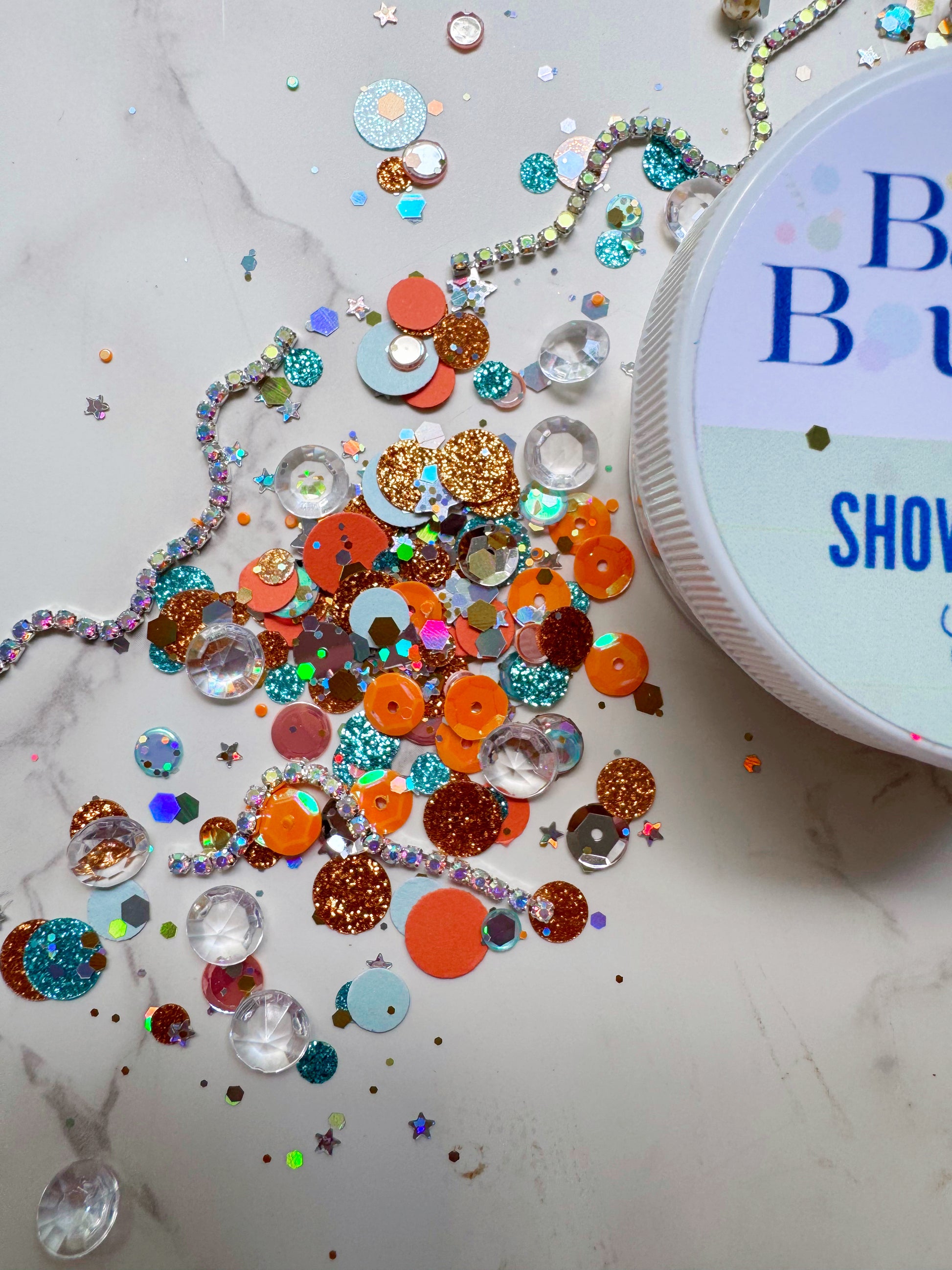 Show Business confetti is a luxurious confetti mix including rare sequins, faux pearls, rhinestone ribbon and all that glitters! A 1 oz limited confetti mix here to help us all welcome the 12th era. Small batch confetti with big sparkle!