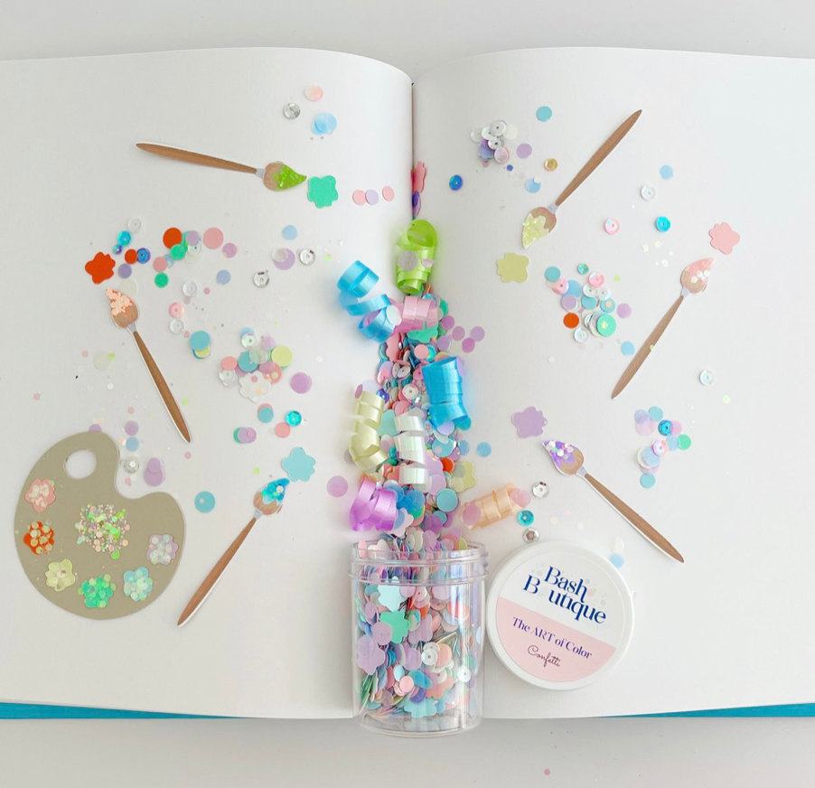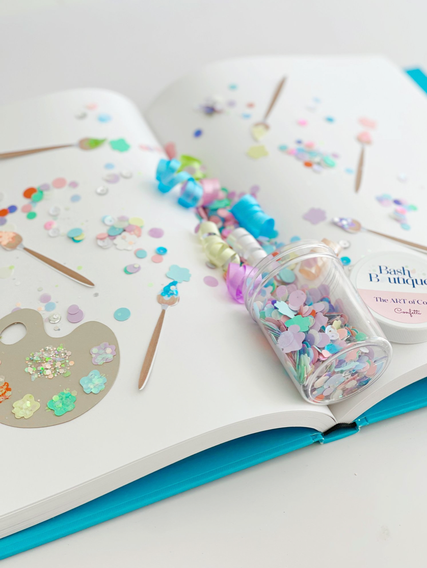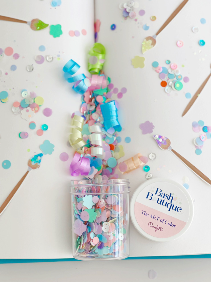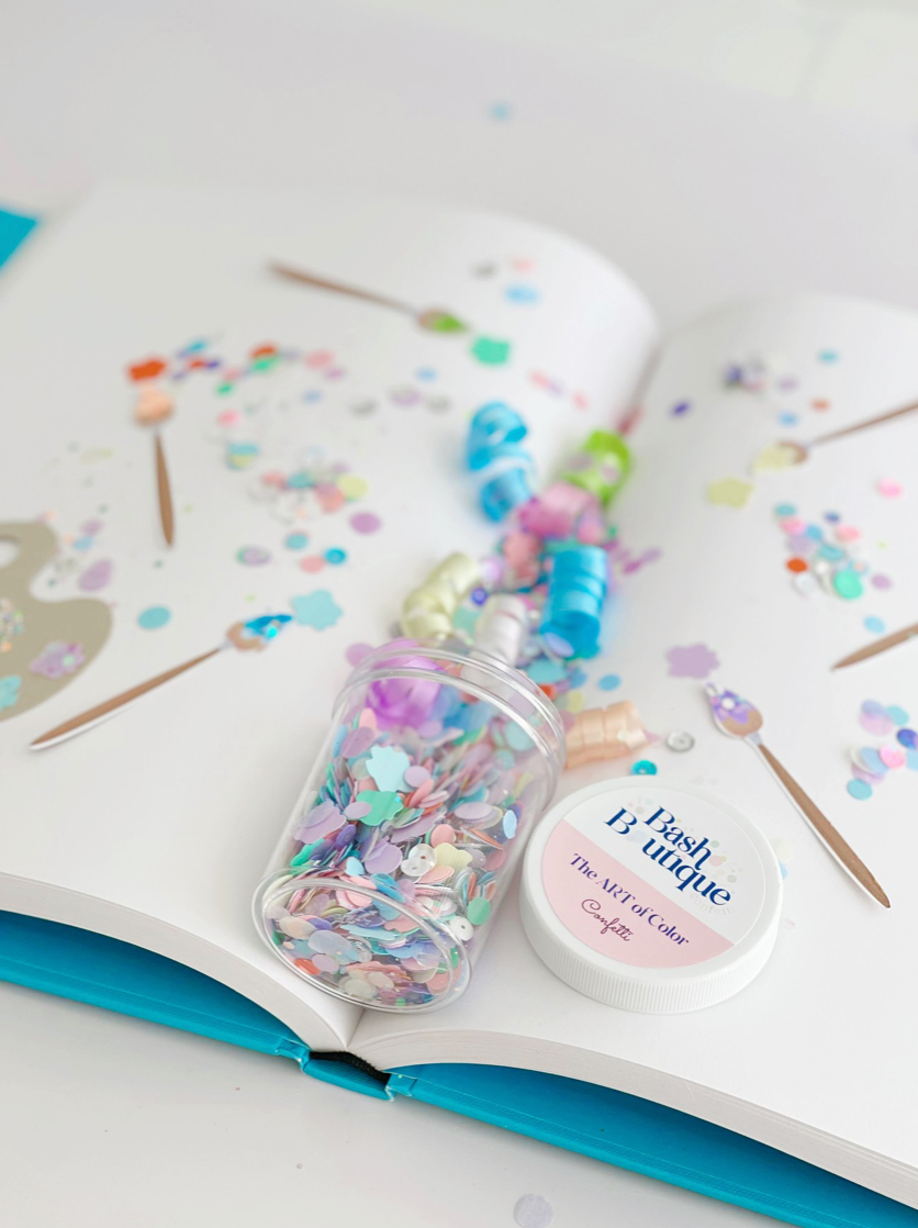 This one takes a page out of my coloring book! Approximately 1/4 cup of pastel rainbow confetti with paint splatter, sequins, glitter and curling ribbon to match! All 6 colored paintbrushes are included in your confetti jar.