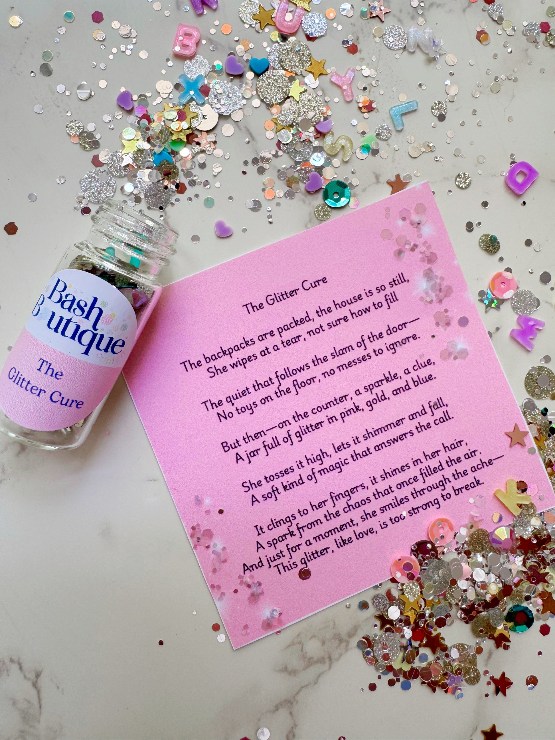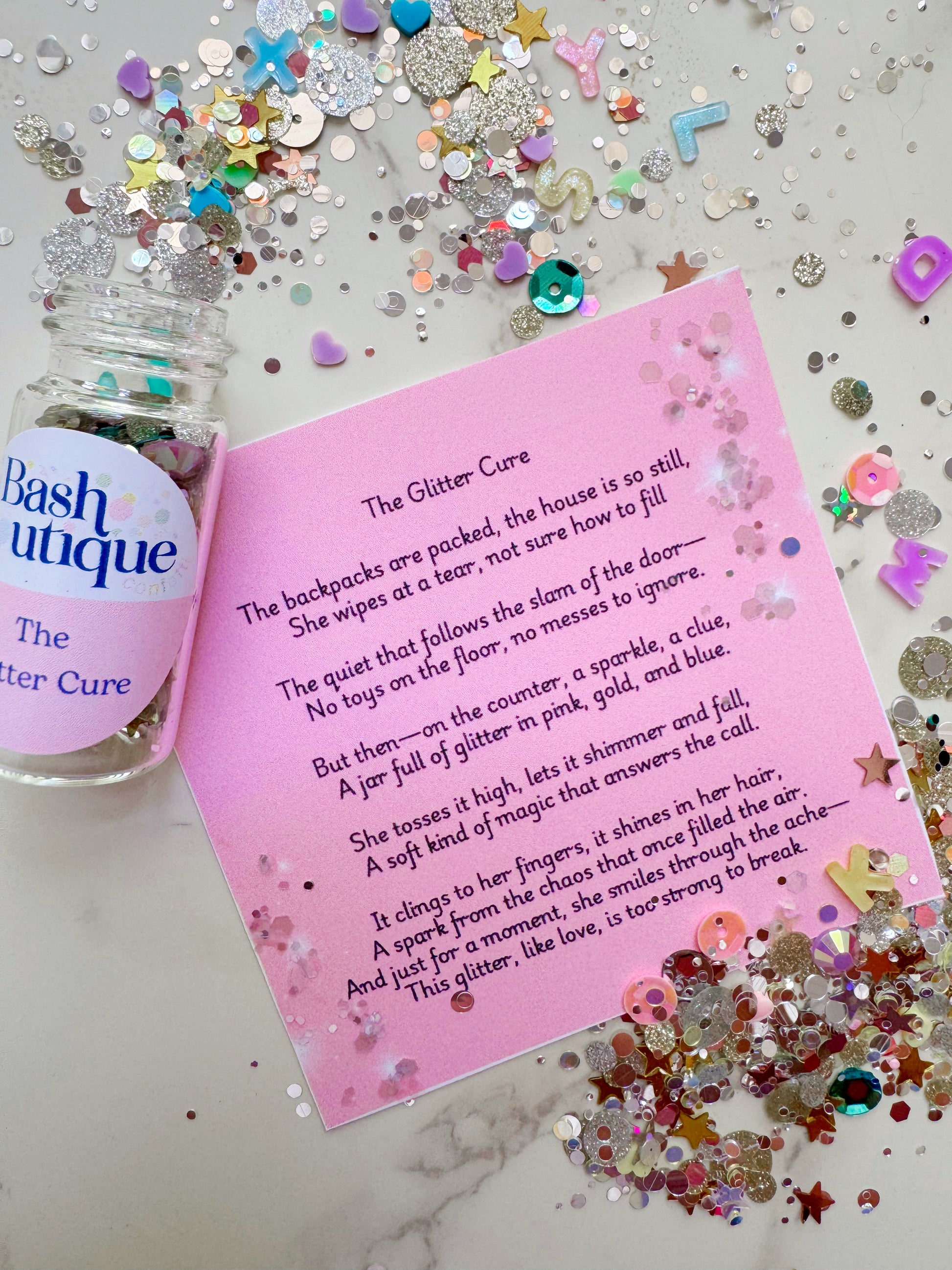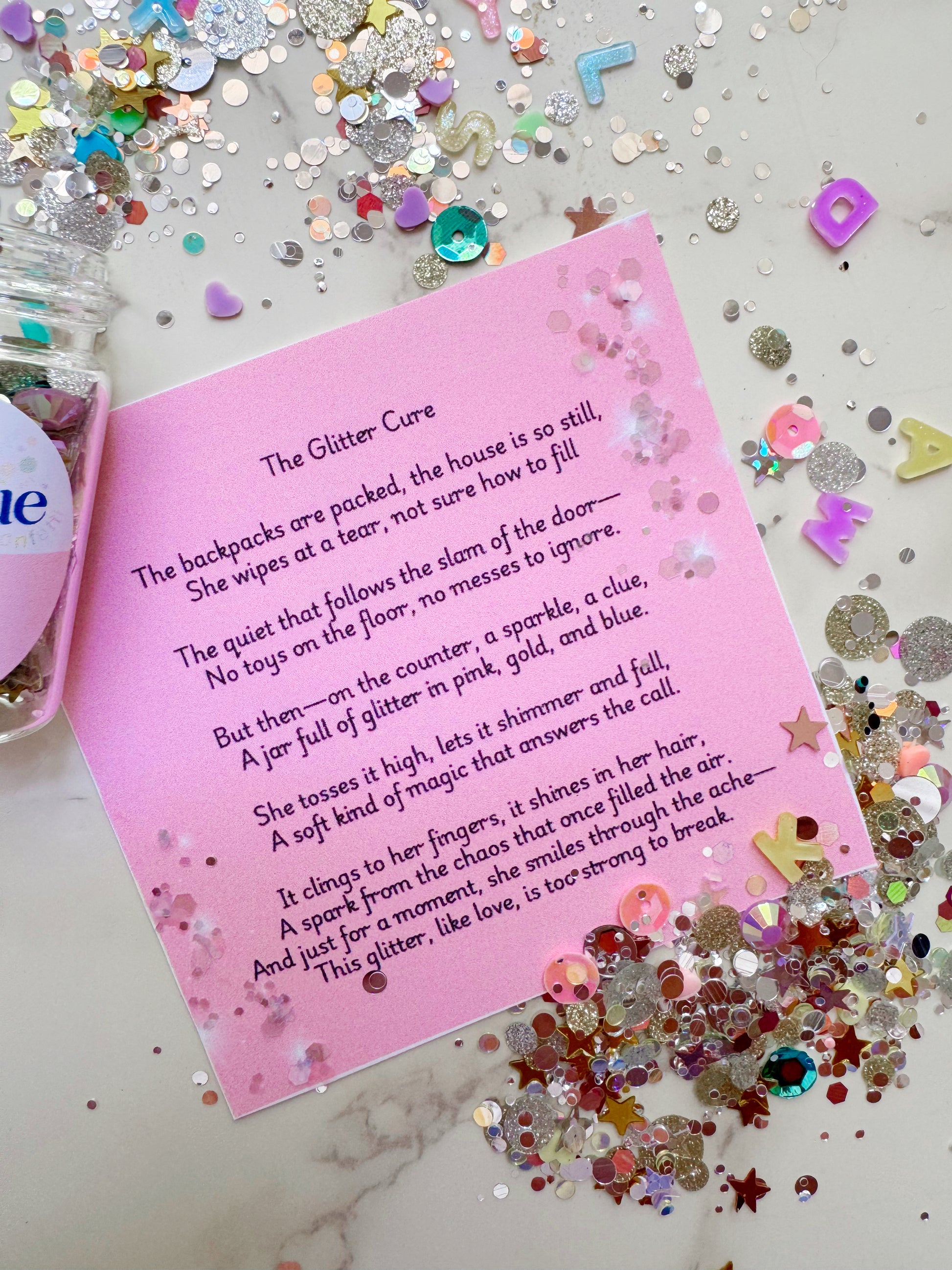 For the mamas out there that feel a little sad when BTS hits. This mix is for you. Comes with one small jar of The Glitter Cure and a hand glittered poem. Perfect to gift to yourself or any mama that needs a pick me up during the Back To School season.